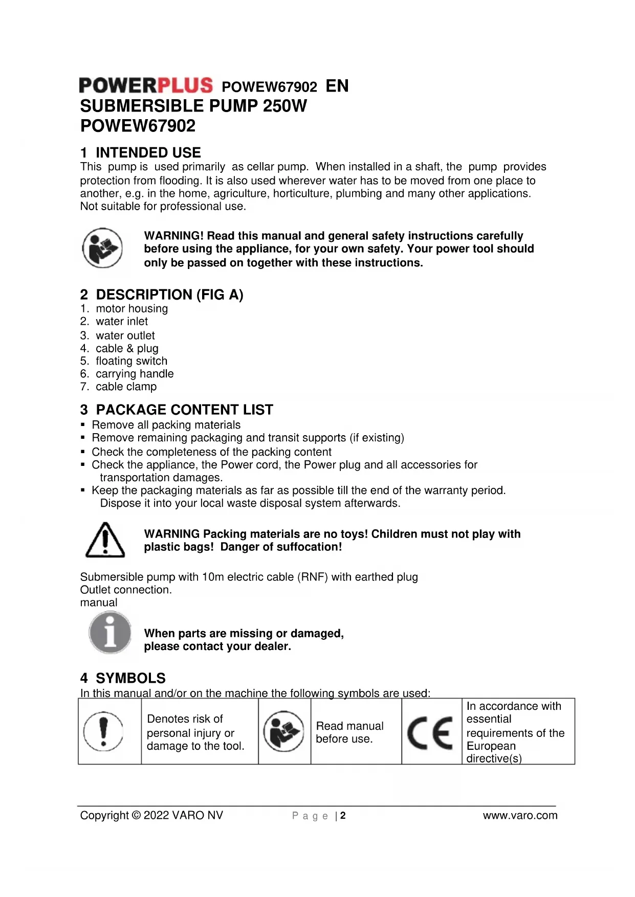 - in a stationary position with a flexible hose pipe. Please note! You should never install the pump by suspending it unsupported from its delivery pipe or Power cable. The submersible pump must be suspended from the specially provided handle or be placed on the bottom of the shaft. To guarantee that the pump works properly, the bottom of the shaft must be kept free of sludge and dirt of all kinds. If the level of water sinks too far, any sludge in the shaft will dry out quickly and stop the pump from starting up. ,Therefore it is necessary to check the submersible motor pump regularly (by carrying out start-up tests). The floater is adjusted in a way that the pump can immediately be started Note! The pump shaft should have minimum dimensions of 40 x 40 x 50 cm, so that the floating switch can move freely.POWEW67902 EN Copyright © 2022 VARO NV P a g e | 4 www.varo.com Mains supply Your new submersible pump is equipped with a shock-proof plug according to regulations. The pump is designed to be connected to a 230V - 50 Hz earthed socket. Make sure that the socket is sufficiently secured (min. 6 Amp.) and is in excellent condition. Introduce the plug into the socket and the pump is ready to go. Important Note! If the mains cable or plug suffers any damage from external action, repairs to the cable should be serviced by a qualified specialist using only standard spare parts. This will ensure that it meets the required safety standards.
