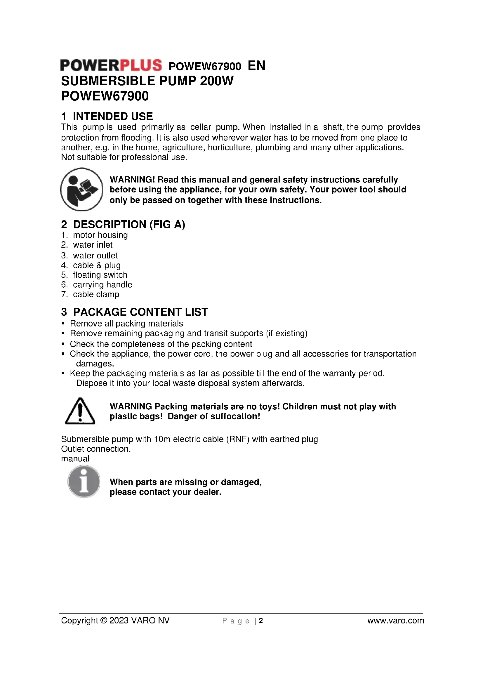 - Keep the packaging materials as far as possible till the end of the warranty period. Dispose it into your local waste disposal system afterwards. WARNING Packing materials are no toys! Children must not play with plastic bags! Danger of suffocation! Submersible pump with 10m electric cable (RNF) with earthed plug Outlet connection. manual When parts are missing or damaged, please contact your dealer.POWEW67900 EN Copyright © 2023 VARO NV P a g e | 3 www.varo.com 4 SYMBOLS In this manual and/or on the machine the following symbols are used: