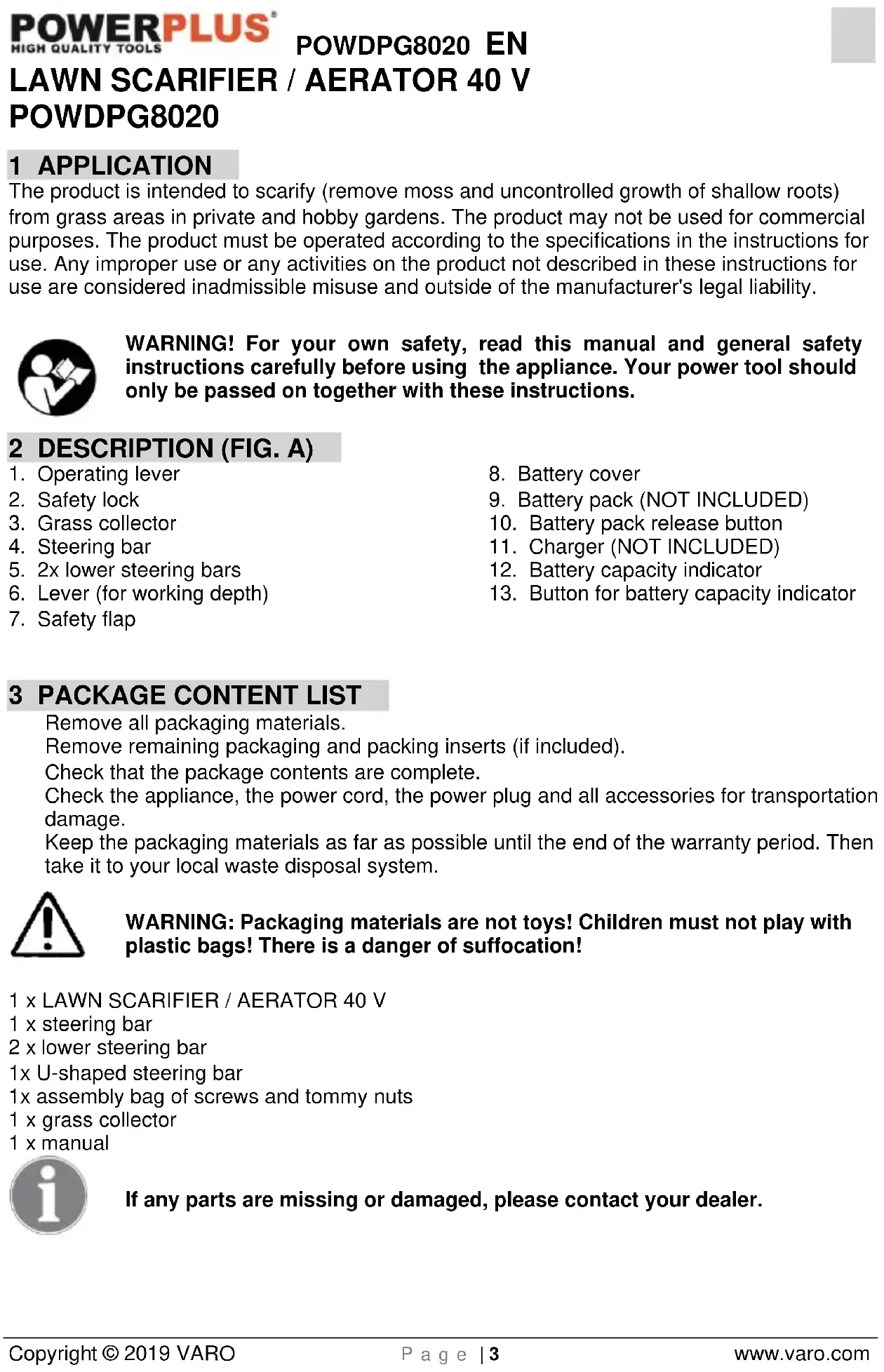 POWDPG8020 Voltage 40 V Idling speed 3800 min-1 Working Width 360 mm Working depth (venting) 5 to 0 mm Working depth (scarifying) -3 to -12 mm Engine type Brushless Volume collection bag 45 l Degree of protection IPX1 15 NOISE Noise values measured according to relevant standard. (K=3) Acoustic pressure level LpA 83 dB(A) Acoustic power level LwA 96 dB(A) ATTENTION! The sound power level may exceed 85 dB(A), in this case individual hearing protection shall be worn. aw (Vibration) 8,7 m/s² K = 1.5 m/s²POWDPG8020 EN Copyright © 2019 VARO P a g e | 12 www.varo.com 16 SERVICE DEPARTMENT Damaged switches must be replaced by our after-sales service department. If the connecting cable (or mains plug) is damaged, it must be replaced by a particular connecting cable which is available from our service department. Replacement of the connecting cable must only be carried out by our service department (see last page) or by a qualified person (qualified electrician). 17 STORAGE Thoroughly clean the whole machine and its accessories. Store it out of the reach of children, in a stable and secure position, in a cool and dry place, avoid too high and too low temperatures. Protect it from exposure to direct sunlight. Keep it in the dark, if possible. Don’t keep it in plastic bags to avoid humidity build-up. 18 WARRANTY This product is warranted for a 36-month period effective from the date of purchase by the first user. This warranty covers all material or production flaws excluding : batteries, chargers, defective parts subject to normal wear & tear such as bearings, brushes, cables, and plugs, or accessories such as drills, drill bits, saw blades, etc. ; damage or defects resulting from maltreatment, accidents or alterations; nor the cost of transportation. Damage and/or defects resulting from inappropriate use also do not fall under the warranty provisions. We also disclaim all liability for any bodily injury resulting from inappropriate use of the tool. Repairs may only be carried out by an authorised customer service centre for Powerplus tools. You can always obtain more information at the number 00 32 3 292 92 90. Any transportation costs shall always be borne by the customer, unless agreed otherwise in writing. At the same time, no claim can be made on the warranty if the damage of the device is the result of negligent maintenance or overload. Definitely excluded from the warranty is damage resulting from fluid permeation, excessive dust penetration, intentional damage (on purpose or by gross carelessness), inappropriate usage (use for purposes for which the device is not suitable), incompetent usage (e.g. not following the instructions given in the manual), inexpert assembly, lightning strike, erroneous net voltage. This list is not exhaustive. Acceptance of claims under warranty can never lead to the prolongation of the warranty period nor commencement of a new warranty period in case of a device replacement. Devices or parts which are replaced under the warranty therefore remain the property of Varo NV. We reserve the right to reject a claim whenever the purchase cannot be verified or when it is clear that the product has not been properly maintained. (Clean ventilation slots, carbon brushes serviced regularly, etc.). Your purchase receipt must be kept as proof of date of purchase. Your appliance must be returned undismantled to your dealer in an acceptably clean state, (in its original blow-moulded case if applicable to the unit), accompanied by proof of purchase.POWDPG8020 EN Copyright © 2019 VARO P a g e | 13 www.varo.com 19 ENVIRONMENT Should your appliance need replacement after extended use, do not discard it with the household rubbish but dispose of it in an environmentally safe way. Waste produced by electrical machine items should not be handled like normal household rubbish. Please recycle where recycle facilities exist. Check with your Local Authority or retailer for recycling advice.
