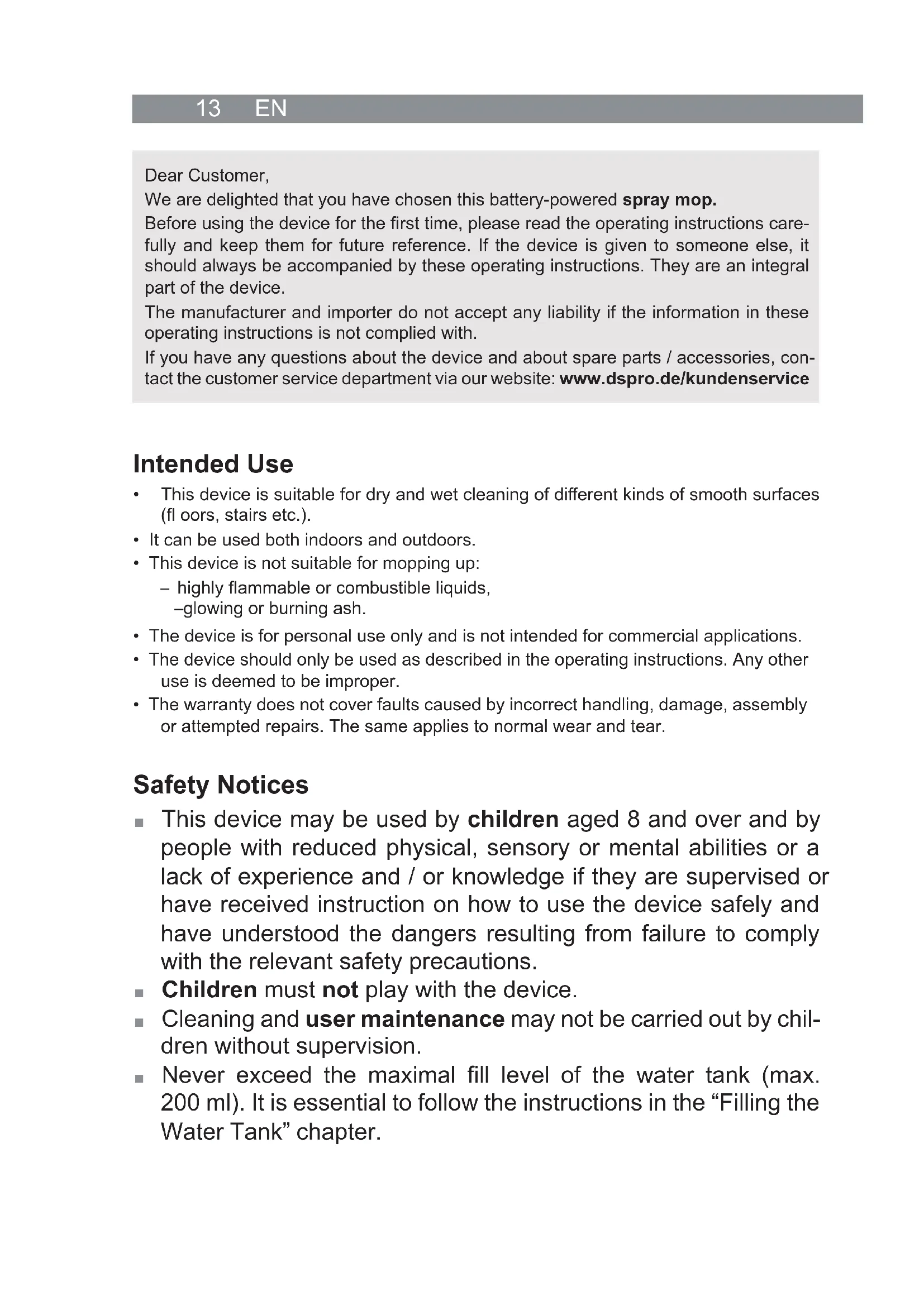 - The warranty does not cover faults caused by incorrect handling, damage, assembly or attempted repairs. The same applies to normal wear and tear. Safety Notices ■ This device may be used by children aged 8 and over and by people with reduced physical, sensory or mental abilities or a lack of experience and / or knowledge if they are supervised or have received instruction on how to use the device safely and have understood the dangers resulting from failure to comply with the relevant safety precautions. ■ Children must not play with the device. ■ Cleaning and user maintenance may not be carried out by chil- dren without supervision. ■ Never exceed the maximal fi ll level of the water tank (max. 200 ml). It is essential to follow the instructions in the “Filling the Water Tank” chapter. Dear Customer, We are delighted that you have chosen this battery-powered spray mop. Before using the device for the fi rst time, please read the operating instructions care- fully and keep them for future reference. If the device is given to someone else, it should always be accompanied by these operating instructions. They are an integral part of the device. The manufacturer and importer do not accept any liability if the information in these operating instructions is not complied with. If you have any questions about the device and about spare parts / accessories, con- tact the customer service department via our website: www.dspro.de/kundenserviceEN 14 ■ The device must always be switched off and disconnected from the mains power before it is cleaned. ■ Charge the battery only with the mains adapter supplied with it. Do not charge any other devices with the mains adapter that is supplied. ■ Do not make any modifi cations to the device! If the device, the connecting cable or the battery are damaged, they must be replaced or repaired by the manufacturer, customer service department or a similarly qualifi ed person (e. g. specialist work- shop) in order to avoid any hazards. DANGER – Danger of Electric Shock! ■ Charge and store the device only in closed rooms. ■ Never immerse the device and the connecting cable in water or other liquids and ensure that these components cannot fall into water or become wet. ■ If the device falls into water while it is connected to the mains power, switch off the power supply immediately. Only after this should you pull the device out of the water and dispose of it. ■ Never touch the device and the connecting cable with wet hands when the device is connected to the mains power. ■ If the device is used outdoors, make sure that it is not exposed to any rain or moisture. WARNING – Danger of Injury! ■ Danger of suff ocation! Keep children and animals away from the packaging material. ■ Danger of strangulation! Make sure that the connecting cable is always kept out of the reach of small children and animals. ■ Danger of burns from battery acid! If the battery leaks, avoid physical contact with the battery acid. Wear protective gloves if necessary. If you touch battery acid, rinse the aff ected areas with abundant clear water straight away and seek medical assis- tance immediately. ■ Danger of tripping! Make sure that the connecting cable does not present a trip hazard. ■ Do not use the device if it is damaged.15 EN WARNING – Danger from Rechargeable Batteries! ■ The main unit with a built-in battery must not be taken apart, thrown into a fi re or exposed to high temperatures of over +40 °C. The battery could ignite or explode. ■ Make sure that the device, and in particular the main unit, cannot get wet. Do not use the device if liquid has got into it. The battery in the main unit could ignite or explode. ■ Do not cover the device and the mains adapter during charging in order to prevent any overheating. NOTICE – Risk of Damage to Material and Property ■ Make sure that the connecting cable is not squashed, bent or laid over sharp edges and does not come into contact with hot surfaces. ■ Do not wrap the mains cable around the mains adapter. ■ The device should only be used if it has been fully and correctly assembled! ■ Remove the mains adapter from the plug socket if a fault occurs during charging or if a thunderstorm is expected. ■ The device must be switched off when the mains adapter is pulled out or inserted into the plug socket. Always pull the mains adapter and never the mains cable to discon- nect the device from the mains power. ■ Do not use the device when it is still connected to the mains adapter. ■ Protect the device from: heat, naked fl ames, sub-zero temperatures, direct sunlight and impacts. ■ Use only original accessories from the manufacturer in order to guarantee that there is no interference that may prevent the device from working and to avoid possible damage. Items Supplied