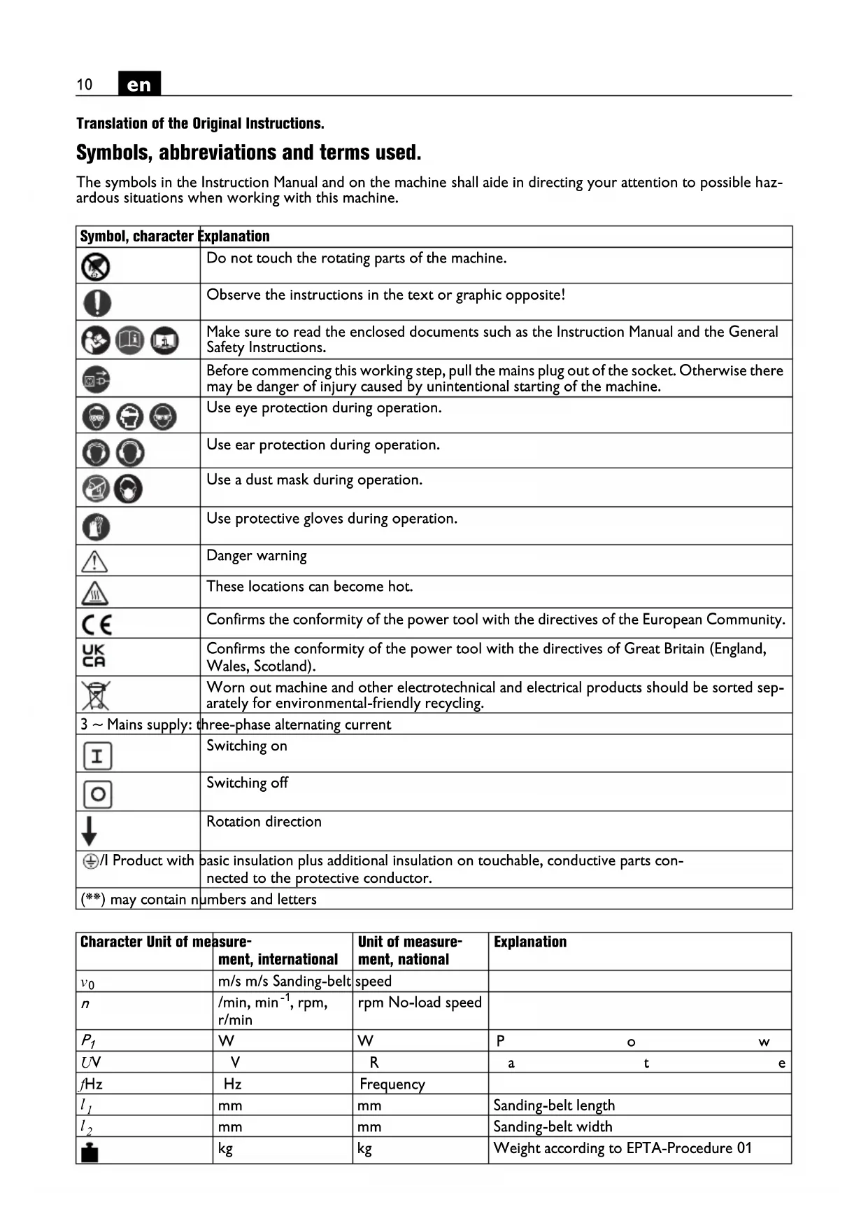 Translation of the Original Instructions. Symbols, abbreviations and terms used. The symbols in the Instruction Manual and on the machine shall aide in directing your attention to possible haz- ardous situations when working with this machine. Symbol, character Explanation Do not touch the rotating parts of the machine. Observe the instructions in the text or graphic opposite! Make sure to read the enclosed documents such as the Instruction Manual and the General Safety Instructions. Before commencing this working step, pull the mains plug out of the socket. Otherwise there may be danger of injury caused by unintentional starting of the machine. Use eye protection during operation. Use ear protection during operation. Use a dust mask during operation. Use protective gloves during operation. Danger warning These locations can become hot. Confirms the conformity of the power tool with the directives of the European Community. Confirms the conformity of the power tool with the directives of Great Britain (England, Wales, Scotland). Worn out machine and other electrotechnical and electrical products should be sorted sep- arately for environmental-friendly recycling. 3 ~ Mains supply: three-phase alternating current Switching on Switching off Rotation direction /I Product with basic insulation plus additional insulation on touchable, conductive parts con- nected to the protective conductor. (**) may contain numbers and letters Character Unit of measure- ment, international Unit of measure- ment, national Explanation