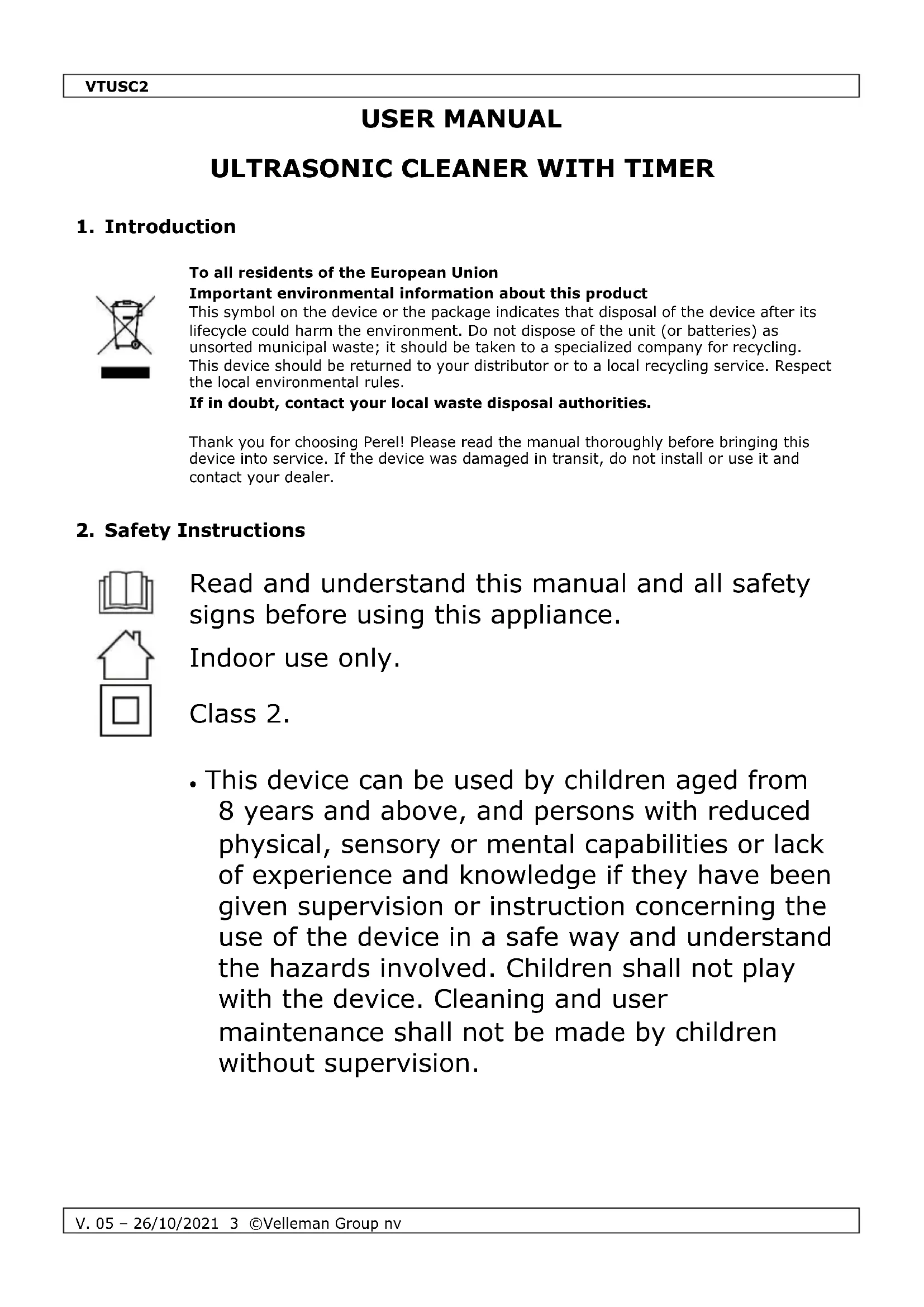 VTUSC2 - Ultrasonic cleaner Perel - Free user manual and instructions