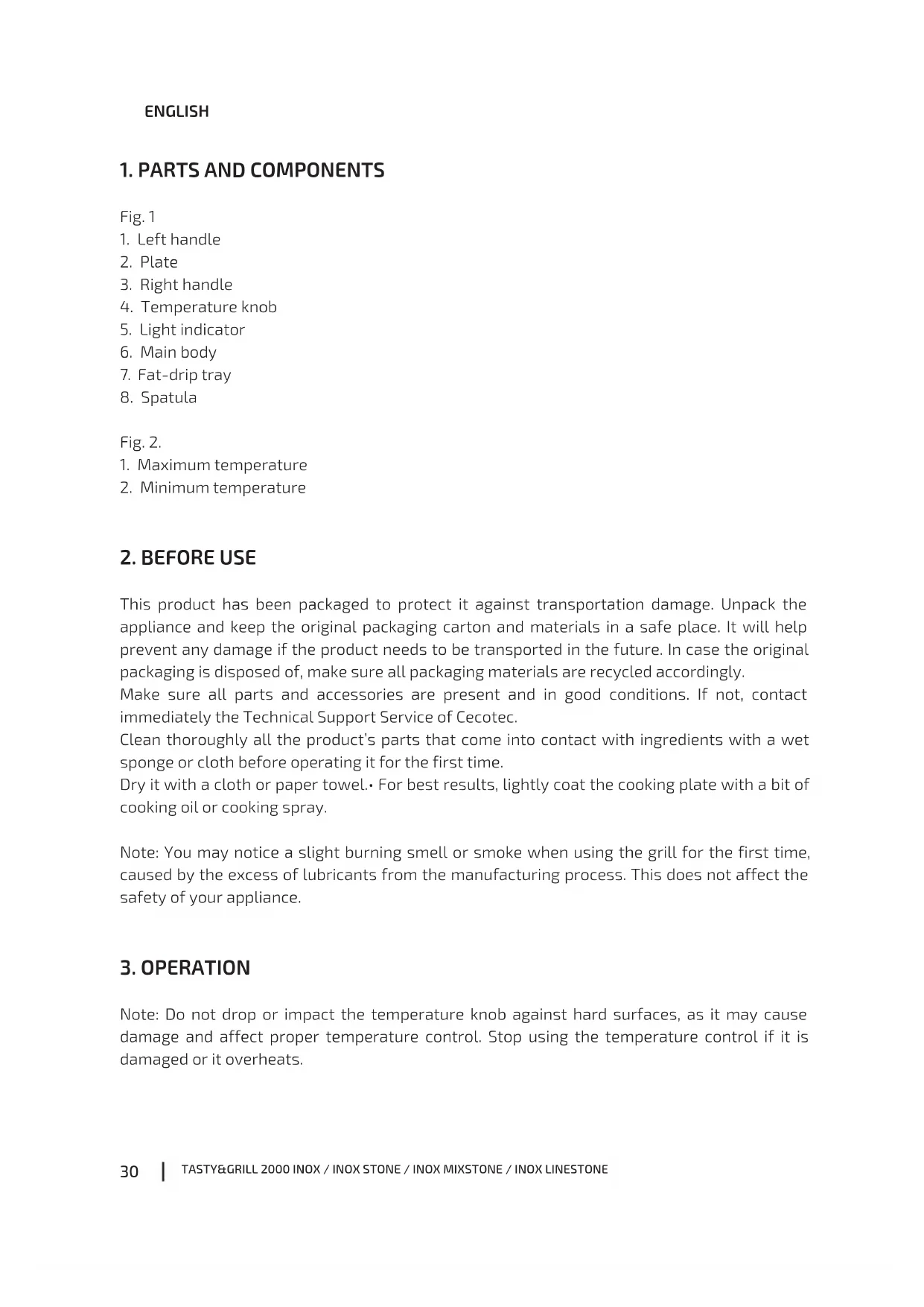 This product has been packaged to protect it against transportation damage. Unpack the appliance and keep the original packaging carton and materials in a safe place. It will help prevent any damage if the product needs to be transported in the future. In case the original packaging is disposed of, make sure all packaging materials are recycled accordingly. Make sure all parts and accessories are present and in good conditions. If not, contact immediately the Technical Support Service of Cecotec. Clean thoroughly all the product’s parts that come into contact with ingredients with a wet sponge or cloth before operating it for the first time. Dry it with a cloth or paper towel.• For best results, lightly coat the cooking plate with a bit of cooking oil or cooking spray. Note: You may notice a slight burning smell or smoke when using the grill for the first time, caused by the excess of lubricants from the manufacturing process. This does not affect the safety of your appliance.