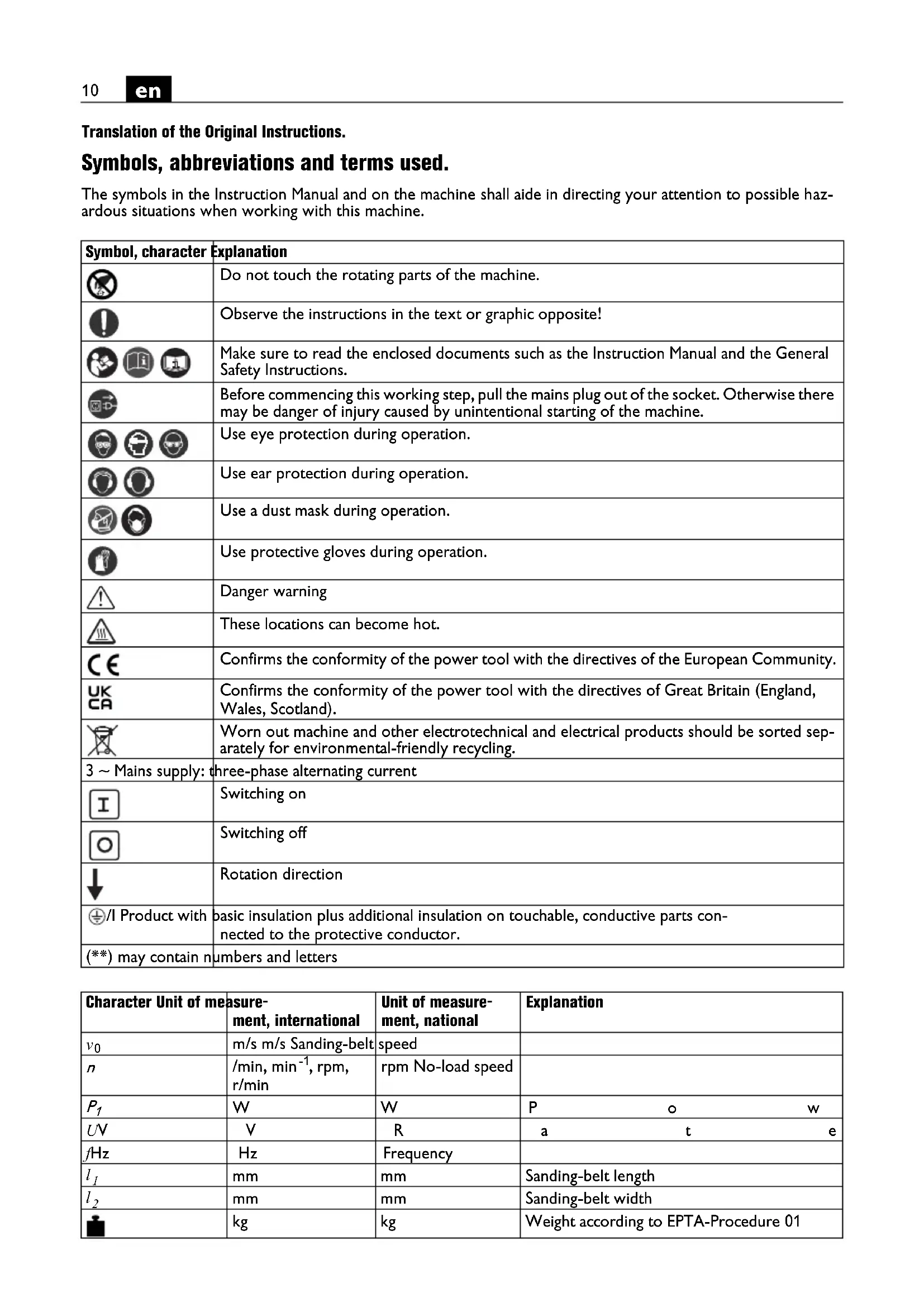 Translation of the Original Instructions. Symbols, abbreviations and terms used. The symbols in the Instruction Manual and on the machine shall aide in directing your attention to possible haz- ardous situations when working with this machine. Symbol, character Explanation Do not touch the rotating parts of the machine. Observe the instructions in the text or graphic opposite! Make sure to read the enclosed documents such as the Instruction Manual and the General Safety Instructions. Before commencing this working step, pull the mains plug out of the socket. Otherwise there may be danger of injury caused by unintentional starting of the machine. Use eye protection during operation. Use ear protection during operation. Use a dust mask during operation. Use protective gloves during operation. Danger warning These locations can become hot. Confirms the conformity of the power tool with the directives of the European Community. Confirms the conformity of the power tool with the directives of Great Britain (England, Wales, Scotland). Worn out machine and other electrotechnical and electrical products should be sorted sep- arately for environmental-friendly recycling. 3 ~ Mains supply: three-phase alternating current Switching on Switching off Rotation direction /I Product with basic insulation plus additional insulation on touchable, conductive parts con- nected to the protective conductor. (**) may contain numbers and letters Character Unit of measure- ment, international Unit of measure- ment, national Explanation