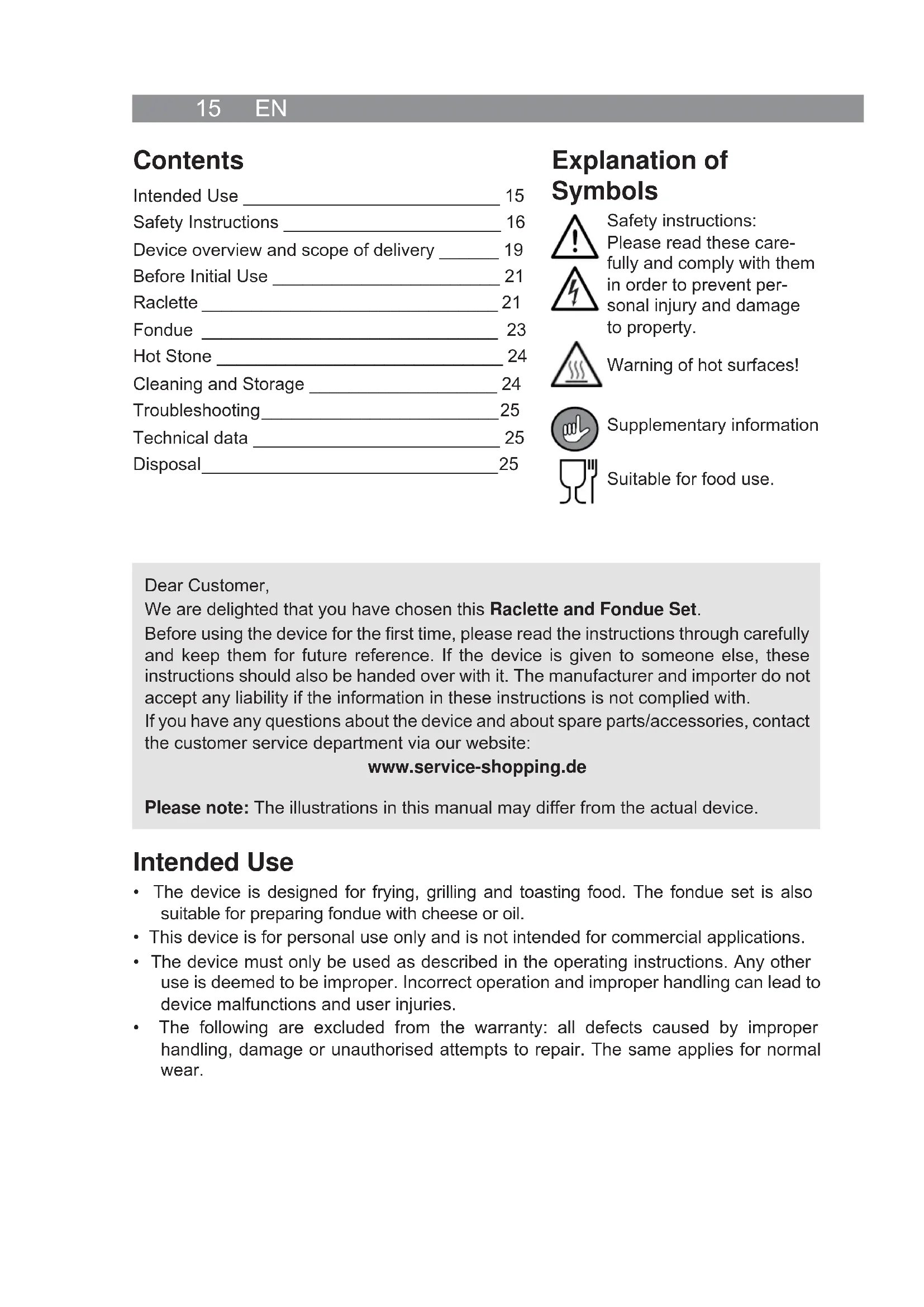- The following are excluded from the warranty: all defects caused by improper handling, damage or unauthorised attempts to repair. The same applies for normal wear. Contents Intended Use __________________________ 15 Safety Instructions ______________________ 16 Device overview and scope of delivery ______ 19 Before Initial Use _______________________ 21 Raclette ______________________________ 21 Fondue ______________________________ 23 Hot Stone _____________________________ 24 Cleaning and Storage ___________________ 24 Troubleshooting ________________________ 25 Technical data _________________________ 25 Disposal ______________________________ 25 Explanation of Symbols Safety instructions: Please read these care- fully and comply with them in order to prevent per- sonal injury and damage to property. Warning of hot surfaces! Supplementary information Suitable for food use.EN 16 Safety Instructions ■ This device may be used by children aged 8 and over and by people with reduced physical, sensory or mental abilities or a lack of experience and/or knowledge if they are supervised or have received instruction on how to use the device safely and have understood the dangers resulting from this. ■ Children must not play with the device. ■ Cleaning and user maintenance may not be performed by children, unless they are older than 8 years of age and are supervised. ■ Children younger than 8 years of age and animals must be kept away from the device and the mains cable. Warning of hot surfaces! The device will become very hot during use. Make absolutely sure that you do not come into contact with any heated parts during and after use of the device. Only touch the handles and the temperature controller while the device is in operation or immediately after it has been switched off. We recommend that you wear oven gloves when handling the device. ■ The device must always be disconnected from the mains power when it is left unattended and before assembling, disassembling or cleaning the device. ■ Do not make any changes to the device. Also do not replace the mains cable yourself. If the device, the mains cable or the plug of the device is damaged, it must be replaced by the manufacturer or customer service department or a similarly qualifi ed person (e.g. specialist workshop) in order to avoid any hazards. ■ The device is not designed to be operated with an external timer or a separate remote control system. ■ ATTENTION: Please note the cleaning instructions in the “Cleaning and Storage” chapter!17 EN Dangers of Injury ■ Keep the device and packaging material away from children and animals. There is a risk of injury and suffocation. ■ ATTENTION Danger of burns! Be careful when handling hot oil or hot cheese in the fondue pot! Never pour water into hot oil or water into other fatty substances! ■ Make sure that the fondue pot or the hot stone are placed securely in the recess which is provided for this purpose in the raclette grill plate. ■ Make sure that the connected mains cable does not present a trip hazard. The cable must not hang down from the surface on which the device is placed in order to prevent the device from being pulled down. ■ Always allow the device to cool down suffi ciently before you clean it and/or store it away. Danger of Electric Shock and Fire ■ Use the device only in closed rooms. ■ Always set up the device with a suffi cient amount of clear space on all sides and clear space above it in order to prevent any build-up of heat. ■ The device should only be connected to a properly installed plug socket with safety contacts. The plug socket must also be readily accessible after connection so that the connection to the mains can quickly be isolated. The mains voltage must match the technical data of the device. Only use suitable extension cables whose technical data is the same as that of the device. ■ Never immerse the device, mains cable or plug in water or other liquids and ensure that they cannot fall into water or become wet. ■ Should the device fall into water, switch off the power supply immediately. Do not attempt to pull it out of the water while it is still connected to the mains power! ■ Do not use the device if it has malfunctioned or been dropped in water. Have it checked in a specialist workshop before using it again. ■ Never touch the device, mains cable or plug with wet hands when these components are connected to the mains power. ■ Switch off the device and pull the mains plug out of the plug socket if an error occurs during operation or before a thunderstorm. ■ Always pull the plug and never the mains cable. ■ Always insert the receptacle for the fondue pot into the raclette grill plate before you place the fondue pot onto the raclette grill plate (see the “Raclette” and “Fondue” chapters). Without the receptacle, it is not possible to guarantee that the pot can be held in place securely. ■ Do not use the device in rooms containing easily ignitable dust or poisonous and explosive fumes. ■ Do not operate the device in a very damp environment or in the vicinity of combustible material. ■ Do not cover the device during operation in order to prevent it from catching fi re. Provide adequate ventilation while the device is in operation. ■ For the fondue, only use fats and oils which are suitable for frying.EN 18 ■ ATTENTION Danger of fi re! Make sure that foodstuffs containing oil and fats are not overheated so that they do not catch fi re. ■ In the event of a fi re: – It is essential to remove the mains plug immediately. – Hot fat / oil may catch fi re if it is overheated. Do not extinguish burning fat / oil with water, but smother the fl ames with a fi re blanket or similar cloth or extinguish a fat fi re with a fi re extinguisher which is capable of extinguishing fi res involving cooking fat! – Do NOT use water to extinguish the fi re as the steam can pose an additional risk of scalding. –