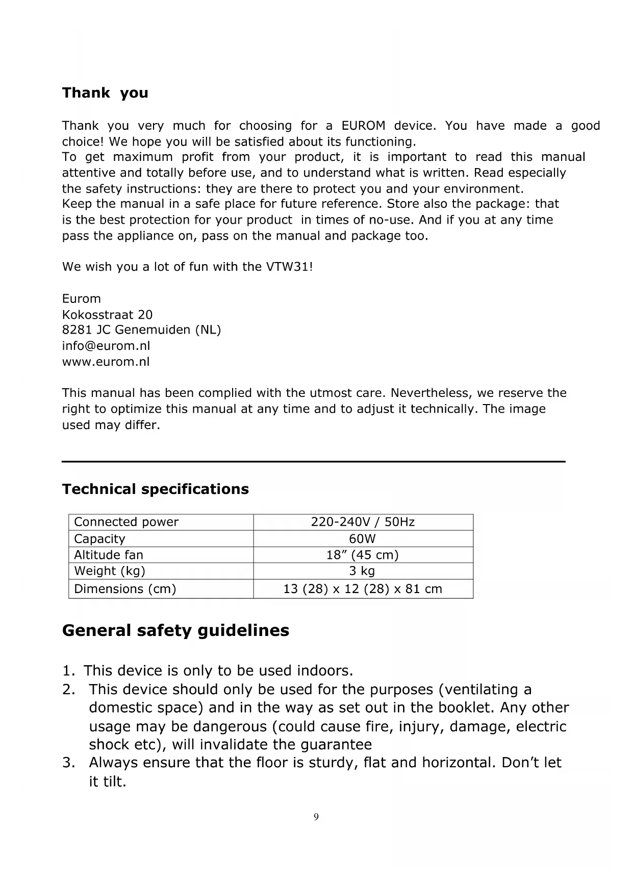 Download the instructions for your Fan in PDF format for free! Find your manual VTW31 - Eurom and take your electronic device back in hand. On this page are published all the documents necessary for the use of your device. VTW31 by Eurom.