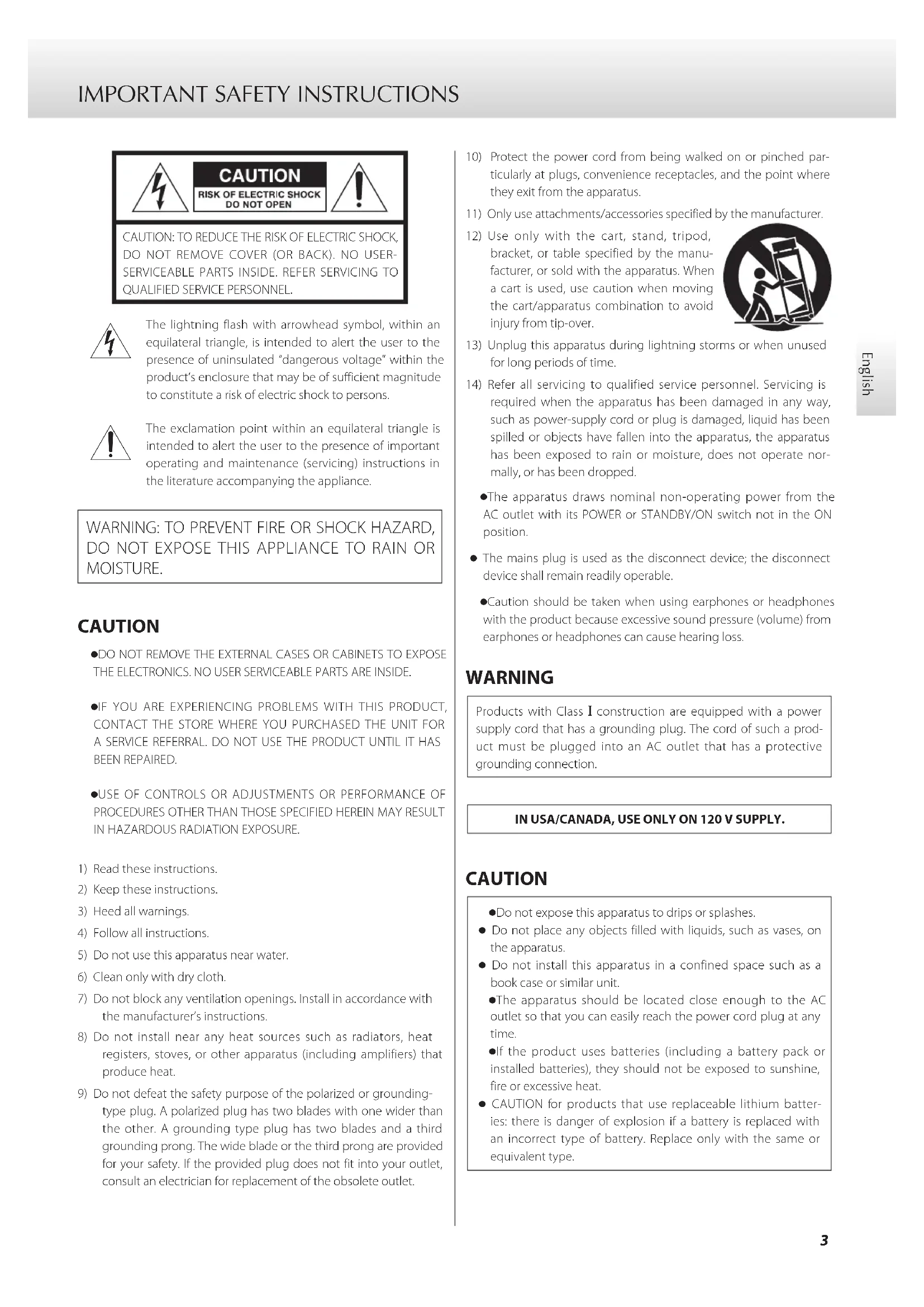 DO NOT EXPOSE THIS APPLIANCE TO RAIN OR MOISTURE. CAUTION o DO NOT REMOVE THE EXTERNAL CASES OR CABINETS TO EXPOSE THE ELECTRONICS. NO USER SERVICEABLE PARTS ARE INSIDE. o IF YOU ARE EXPERIENCING PROBLEMS WITH THIS PRODUCT, CONTACT THE STORE WHERE YOU PURCHASED THE UNIT FOR A SERVICE REFERRAL. DO NOT USE THE PRODUCT UNTIL IT HAS BEEN REPAIRED. o USE OF CONTROLS OR ADJUSTMENTS OR PERFORMANCE OF PROCEDURES OTHER THAN THOSE SPECIFIED HEREIN MAY RESULT IN HAZARDOUS RADIATION EXPOSURE.1) Read these instructions.2) Keep these instructions.3) Heed all warnings.4) Follow all instructions.5) Do not use this apparatus near water.6) Clean only with dry cloth.7) Do not block any ventilation openings. Install in accordance with the manufacturer’s instructions.8) Do not install near any heat sources such as radiators, heat registers, stoves, or other apparatus (including amplifiers) that produce heat.9) Do not defeat the safety purpose of the polarized or grounding-type plug. A polarized plug has two blades with one wider than the other. A grounding type plug has two blades and a third grounding prong. The wide blade or the third prong are provided for your safety. If the provided plug does not fit into your outlet, consult an electrician for replacement of the obsolete outlet.