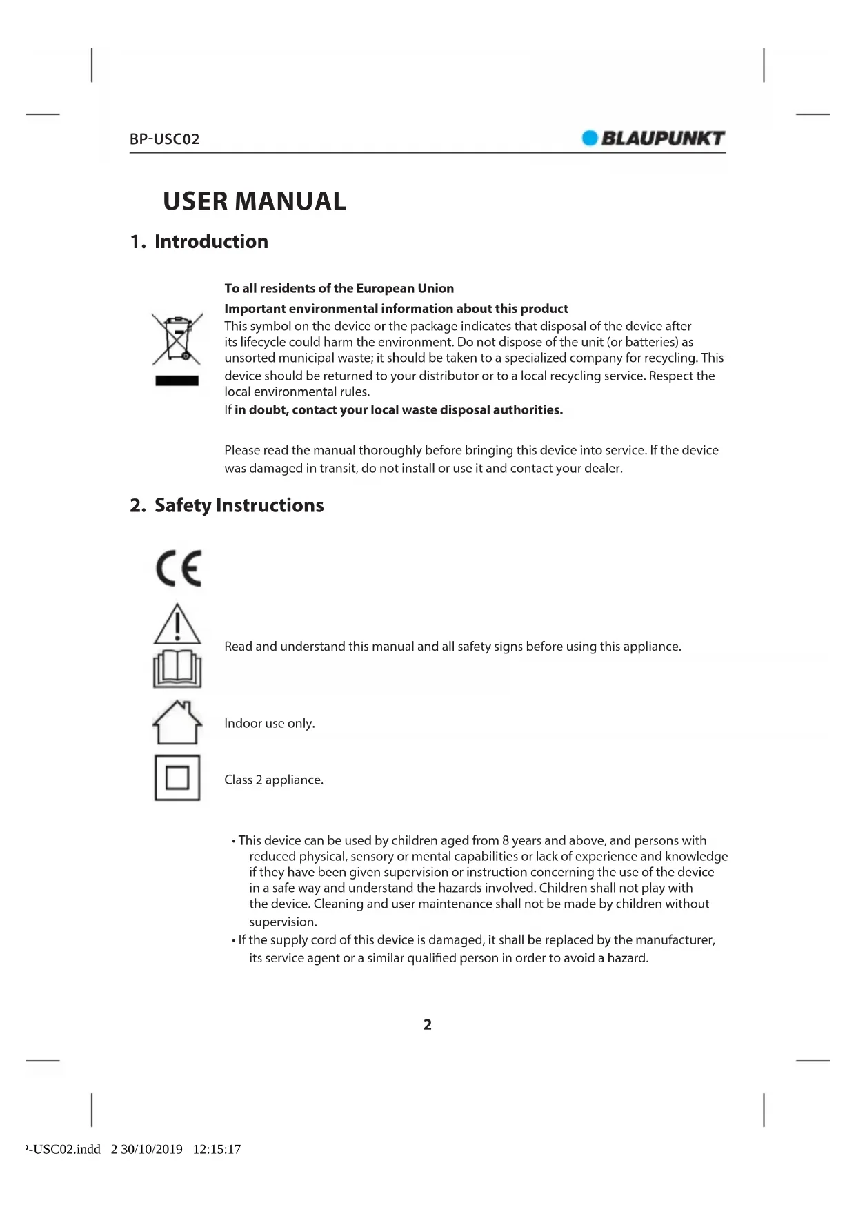 - If the supply cord of this device is damaged, it shall be replaced by the manufacturer, its service agent or a similar qualied person in order to avoid a hazard. BP-USC02.indd 2 30/10/2019 12:15:17BP-USC02