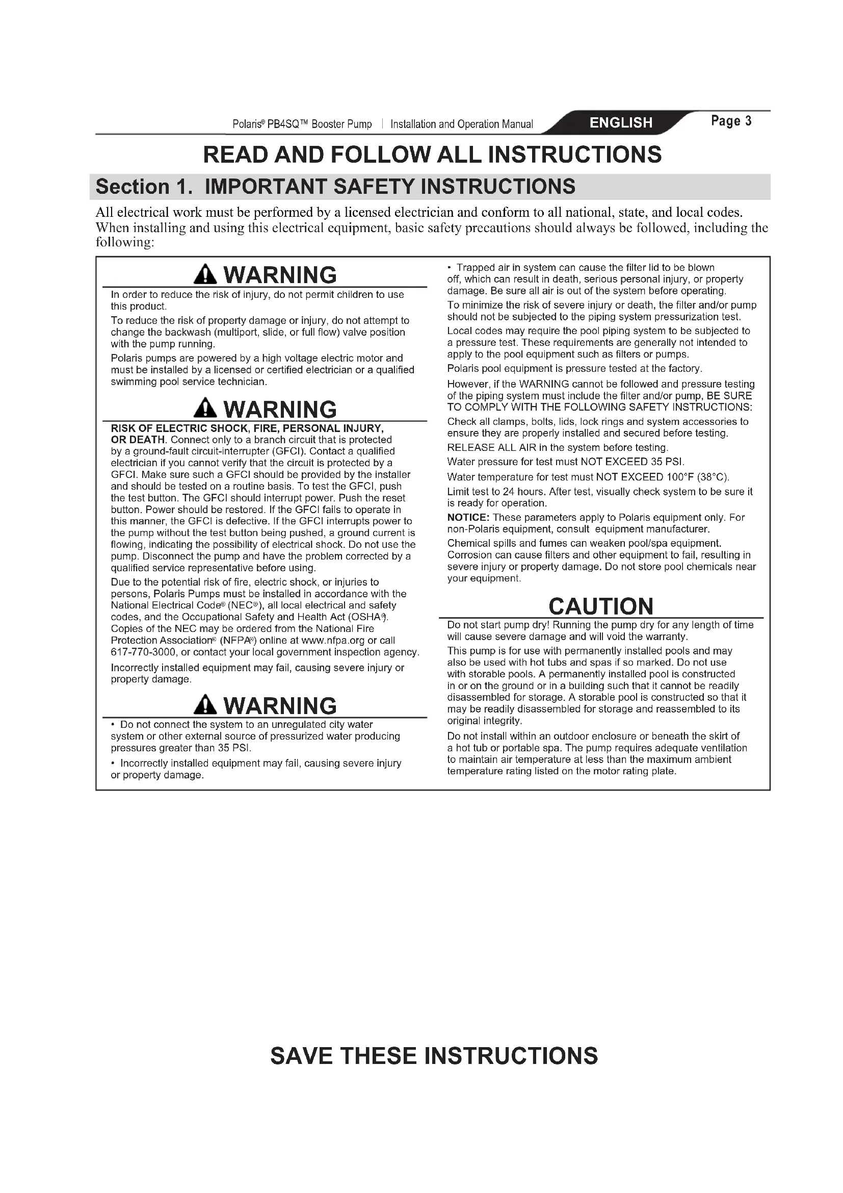 - Trapped air in system can cause the lter lid to be blown off, which can result in death, serious personal injury, or property damage. Be sure all air is out of the system before operating. To minimize the risk of severe injury or death, the lter and/or pump should not be subjected to the piping system pressurization test. Local codes may require the pool piping system to be subjected to a pressure test. These requirements are generally not intended to apply to the pool equipment such as lters or pumps. Polaris pool equipment is pressure tested at the factory. However, if the WARNING cannot be followed and pressure testing of the piping system must include the lter and/or pump, BE SURE TO COMPLY WITH THE FOLLOWING SAFETY INSTRUCTIONS: Check all clamps, bolts, lids, lock rings and system accessories to ensure they are properly installed and secured before testing. RELEASE ALL AIR in the system before testing. Water pressure for test must NOT EXCEED 35 PSI. Water temperature for test must NOT EXCEED 100°F (38°C). Limit test to 24 hours. After test, visually check system to be sure it is ready for operation. NOTICE: These parameters apply to Polaris equipment only. For non-Polaris equipment, consult equipment manufacturer. Chemical spills and fumes can weaken pool/spa equipment. Corrosion can cause lters and other equipment to fail, resulting in severe injury or property damage. Do not store pool chemicals near your equipment. CAUTION Do not start pump dry! Running the pump dry for any length of time will cause severe damage and will void the warranty. This pump is for use with permanently installed pools and may also be used with hot tubs and spas if so marked. Do not use with storable pools. A permanently installed pool is constructed in or on the ground or in a building such that it cannot be readily disassembled for storage. A storable pool is constructed so that it may be readily disassembled for storage and reassembled to its original integrity. Do not install within an outdoor enclosure or beneath the skirt of a hot tub or portable spa. The pump requires adequate ventilation to maintain air temperature at less than the maximum ambient temperature rating listed on the motor rating plate. SAVE THESE INSTRUCTIONSPage 4 ENGLISH Polaris® PB4SQ™ Booster Pump | Installation and Operation Manual