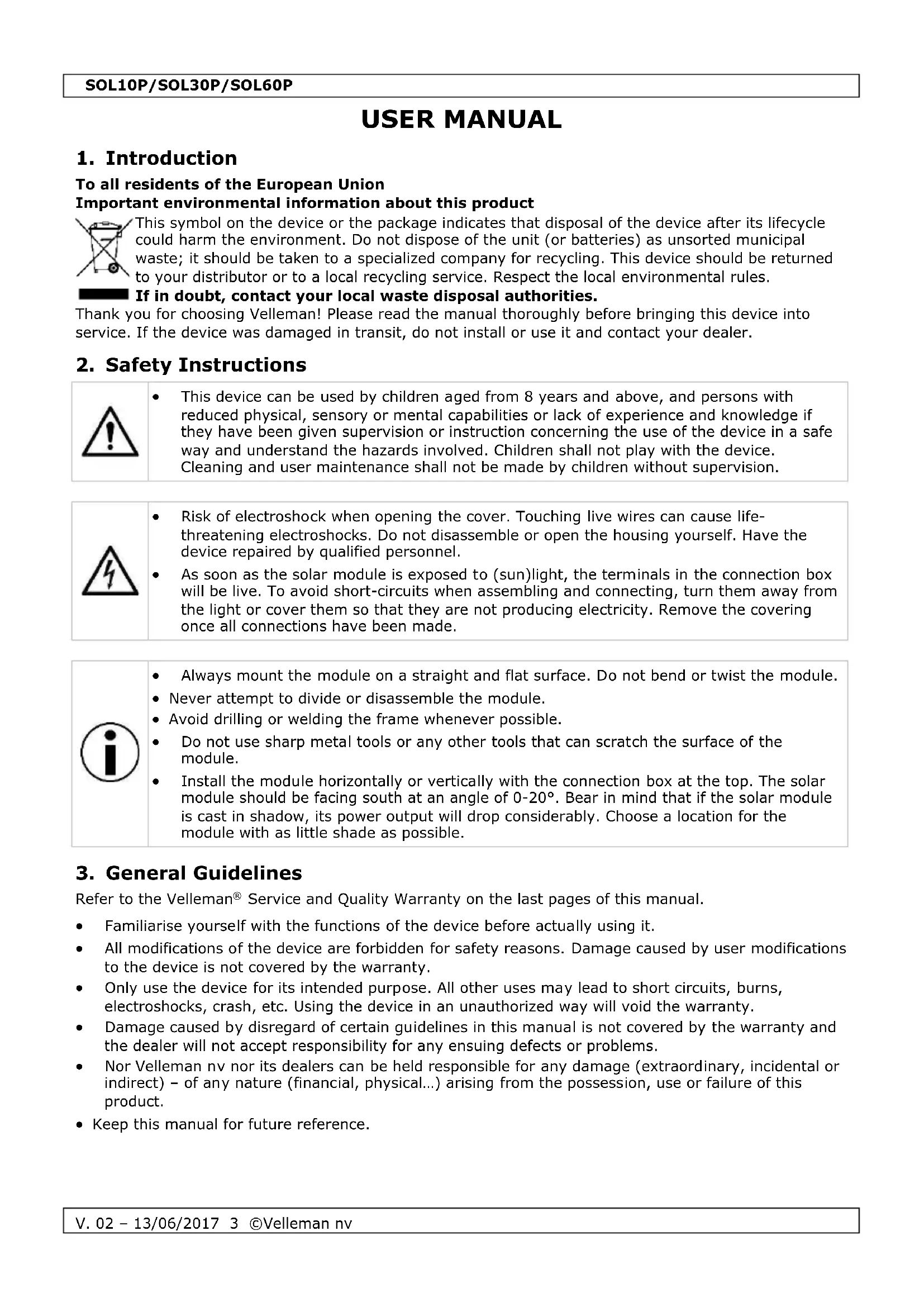Service and Quality Warranty on the last pages of this manual. Familiarise yourself with the functions of the device before actually using it. All modifications of the device are forbidden for safety reasons. Damage caused by user modifications to the device is not covered by the warranty. Only use the device for its intended purpose. All other uses may lead to short circuits, burns, electroshocks, crash, etc. Using the device in an unauthorized way will void the warranty. Damage caused by disregard of certain guidelines in this manual is not covered by the warranty and the dealer will not accept responsibility for any ensuing defects or problems. Nor Velleman nv nor its dealers can be held responsible for any damage (extraordinary, incidental or indirect) – of any nature (financial, physical…) arising from the possession, use or failure of this product. Keep this manual for future reference.SOL10P/SOL30P/SOL60P