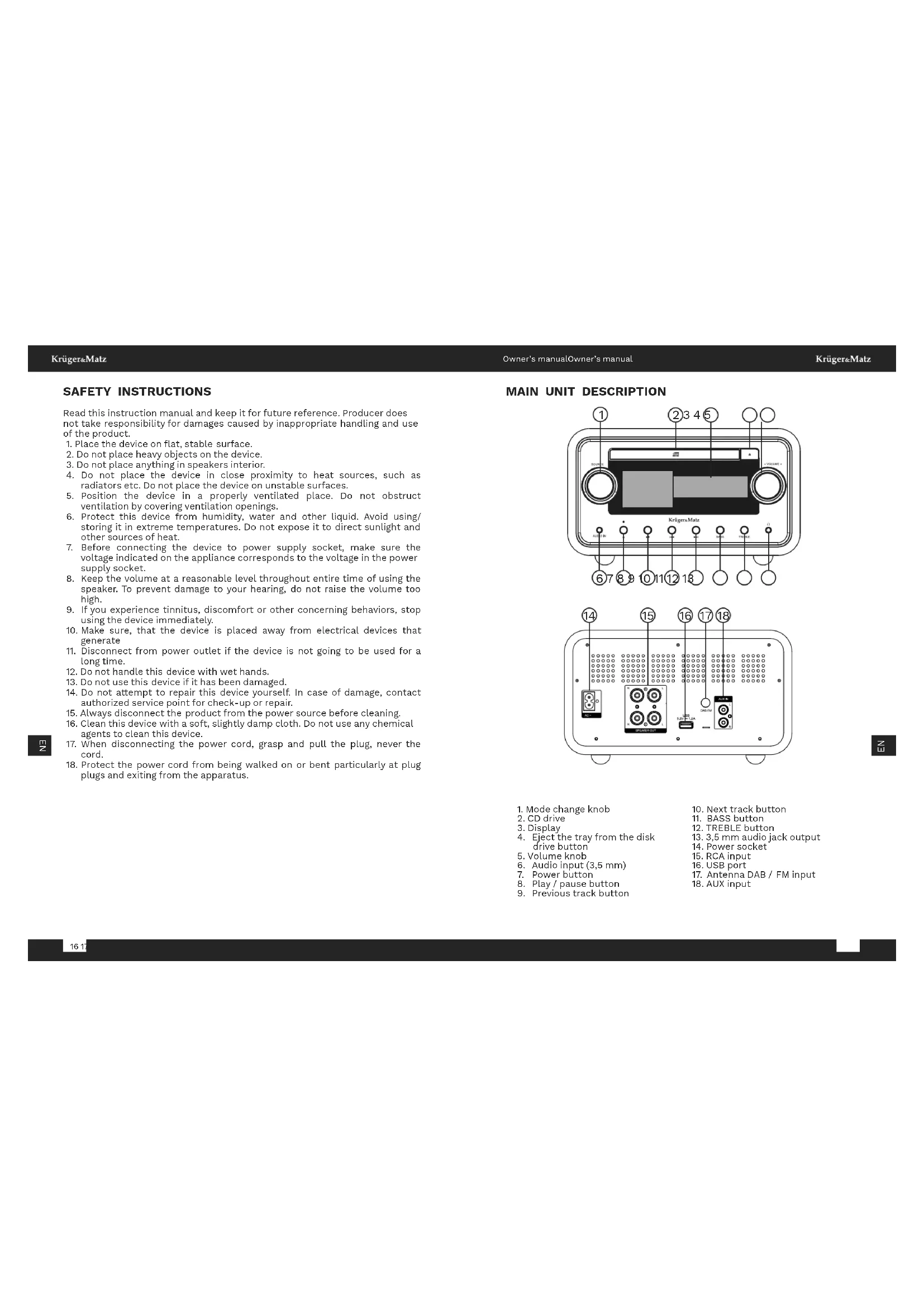 SPECIFICATION General information Tube preamplifier CD disc player Radio: FM / DAB+ Bluetooth + NFC Remote control Playback from USB Charging external devices Technical data DAB+ frequency range: 174,928 - 239,200 MHz FM frequency range: 87,5 - 108 MHz Profiles Bluetooth: A2DP Range: up to 8 meters Max. Bluetooth transmission power: 4 dBm NFC working frequency: 13,56 MHz Woofer: 4,3” (110 mm) Tweeter: 1,5” (38 mm) Output power (RMS): 2 x 30 W Impedance: 6 Ohm THD: <1% (1 KHz, 1 W) Inputs / outputs: Headphone output Jack 3,5 mm 2 x RCA speaker outputs Audio input Jack 3,5 mm AUX input USB port (5 V 1 A) Antenna socket Power socket Power consumption: 35 W Power supply: AC 100 - 240 V~; 50 - 60 Hz Dimensions: Main unit: 250 x 276 x 146 mm Speaker: 160 x 202 x 244 mm English Correct Disposal of This Product (Waste Electrical & Electronic Equipment) It is forbidden to place equipment waste marked with the symbol of a crossed- out trash bin together with other waste. This equipment is subject to collection and recycling. The harmful substances it contains can cause environmental pollution and pose a threat to human health. Made in China for LECHPOL ELECTRONICS Sp. z o.o. Sp.k., ul. Garwolińska 1, 08-400 Miętne. LEARN MORE For more information on this device visit: www.krugermatz.com. Read owner's manual carefully before using. Visit www.krugermatz.com website for more products and accessories. In case of any doubts or questions reach out to our Frequently Asked Questions section.Manuel de l'UtilisateurManuel de l'Utilisateur