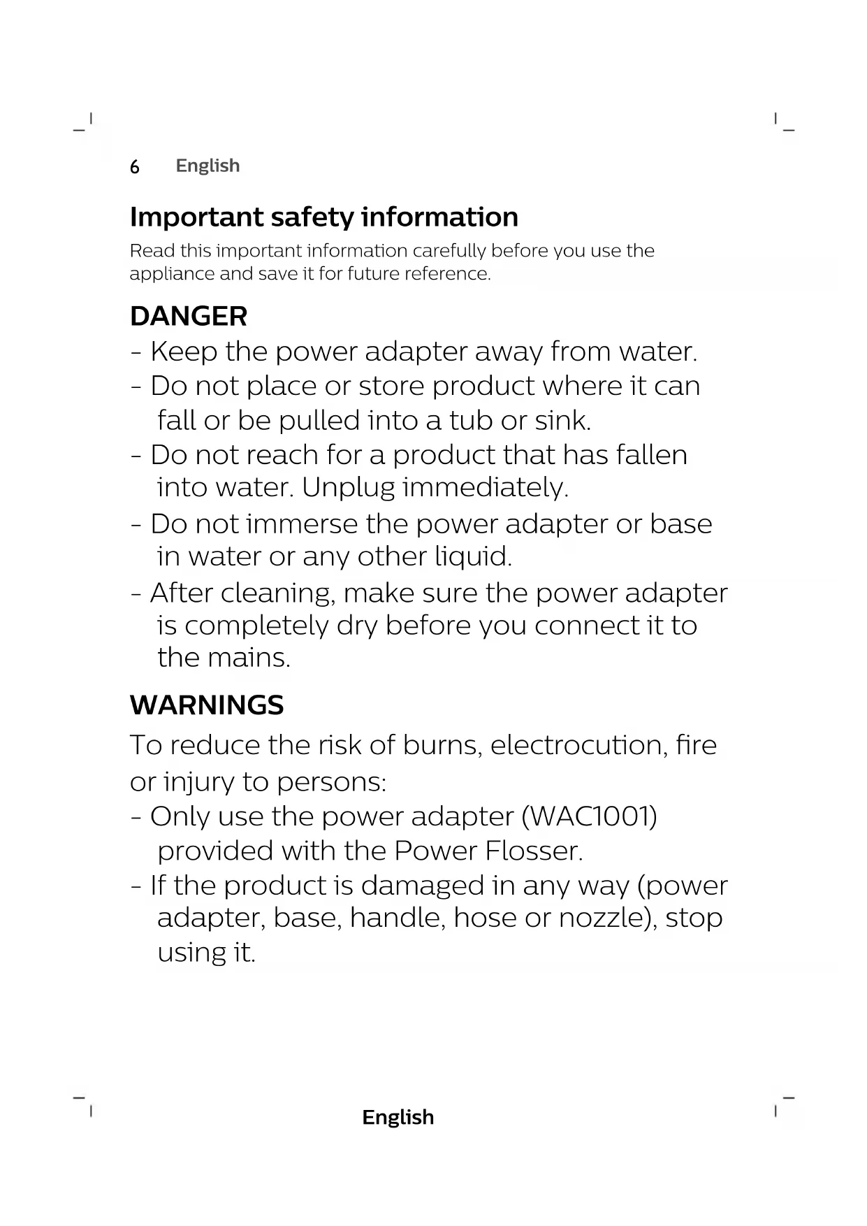1English 6 Deutsch 24 Español 45 Français 64 Italiano 84 Nederlands 104 Português 124 Türkçe 144English Important safety information Read this important information carefully before you use the appliance and save it for future reference. DANGER - Keep the power adapter away from water. - Do not place or store product where it can fall or be pulled into a tub or sink. - Do not reach for a product that has fallen into water. Unplug immediately. - Do not immerse the power adapter or base in water or any other liquid. - After cleaning, make sure the power adapter is completely dry before you connect it to the mains. WARNINGS To reduce the risk of burns, electrocution, fire or injury to persons: - Only use the power adapter (WAC1001) provided with the Power Flosser. - If the product is damaged in any way (power adapter, base, handle, hose or nozzle), stop using it.