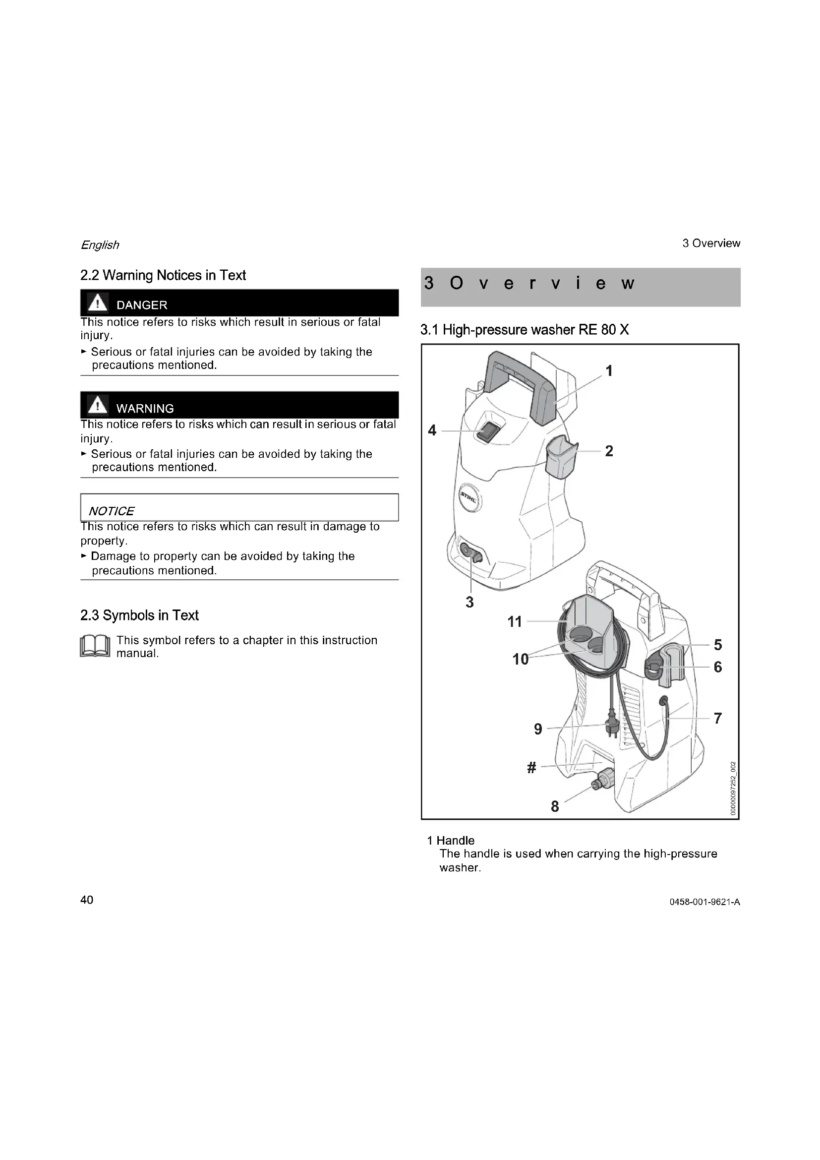 1 Handle The handle is used when carrying the high-pressure washer. This symbol refers to a chapter in this instruction manual. 3Overview