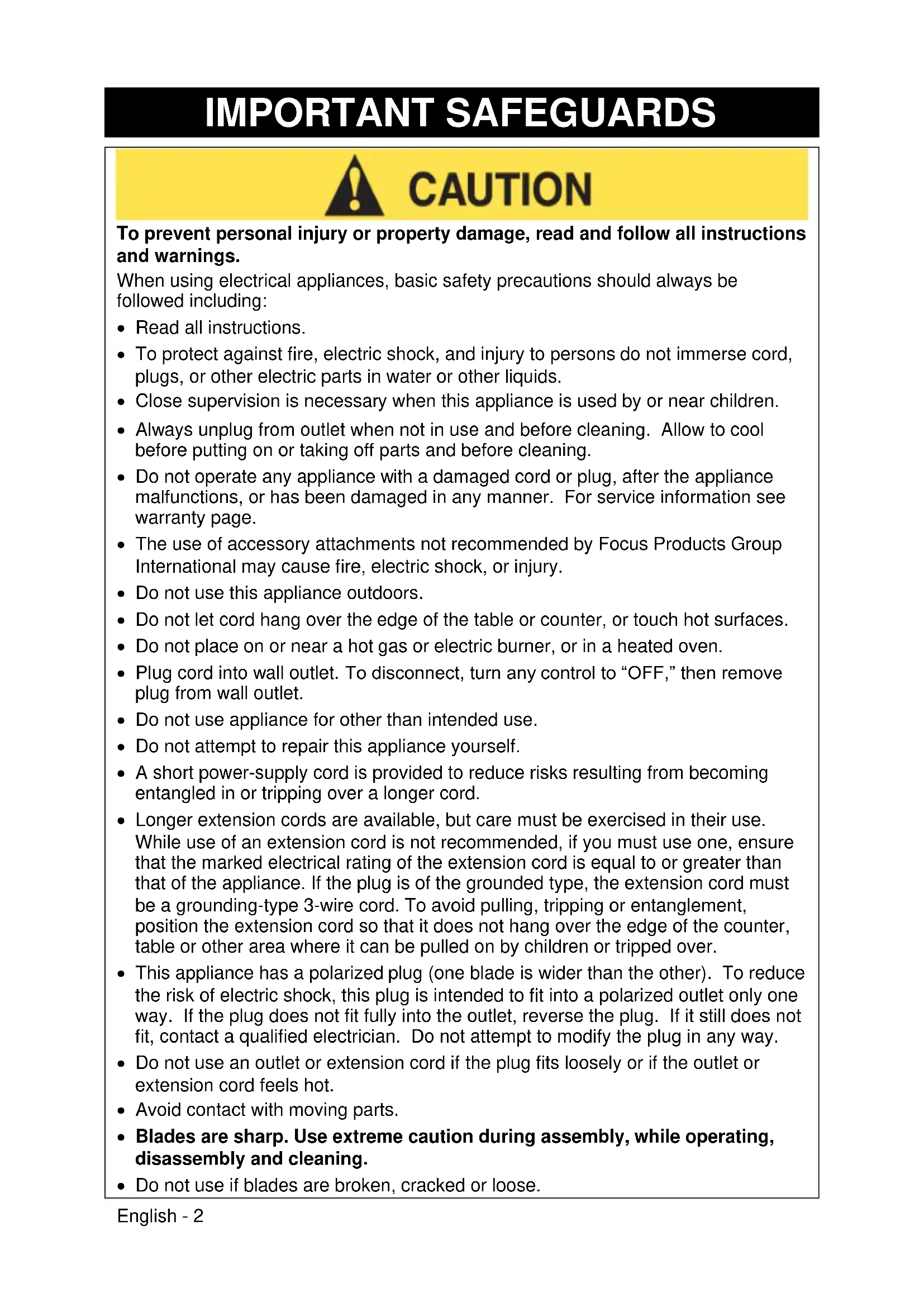 To prevent personal injury or property damage, read and follow all instructions and warnings. When using electrical appliances, basic safety precautions should always be followed including: Read all instructions. To protect against fire, electric shock, and injury to persons do not immerse cord, plugs, or other electric parts in water or other liquids. Close supervision is necessary when this appliance is used by or near children. Always unplug from outlet when not in use and before cleaning. Allow to cool before putting on or taking off parts and before cleaning. Do not operate any appliance with a damaged cord or plug, after the appliance malfunctions, or has been damaged in any manner. For service information see warranty page. The use of accessory attachments not recommended by Focus Products Group International may cause fire, electric shock, or injury. Do not use this appliance outdoors. Do not let cord hang over the edge of the table or counter, or touch hot surfaces. Do not place on or near a hot gas or electric burner, or in a heated oven. Plug cord into wall outlet. To disconnect, turn any control to “OFF,” then remove plug from wall outlet. Do not use appliance for other than intended use. Do not attempt to repair this appliance yourself. A short power-supply cord is provided to reduce risks resulting from becoming entangled in or tripping over a longer cord. Longer extension cords are available, but care must be exercised in their use. While use of an extension cord is not recommended, if you must use one, ensure that the marked electrical rating of the extension cord is equal to or greater than that of the appliance. If the plug is of the grounded type, the extension cord must be a grounding-type 3-wire cord. To avoid pulling, tripping or entanglement, position the extension cord so that it does not hang over the edge of the counter, table or other area where it can be pulled on by children or tripped over. This appliance has a polarized plug (one blade is wider than the other). To reduce the risk of electric shock, this plug is intended to fit into a polarized outlet only one way. If the plug does not fit fully into the outlet, reverse the plug. If it still does not fit, contact a qualified electrician. Do not attempt to modify the plug in any way. Do not use an outlet or extension cord if the plug fits loosely or if the outlet or extension cord feels hot. Avoid contact with moving parts. Blades are sharp. Use extreme caution during assembly, while operating, disassembly and cleaning. Do not use if blades are broken, cracked or loose.English - 3 Do not leave appliance unattended while it is operating. Do not run this appliance continuously for more than 3 minutes as overheating may occur. Allow motor to cool down before repeat usage. Do not run machine without ice in the auger as damage to appliance may occur. Never place fingers or utensils into the feed or discharge areas to reduce the risk of severe injury to persons or damage to the shaver. Always check ice funnel and shaving bowl for presence of foreign objects before using. For household use only.