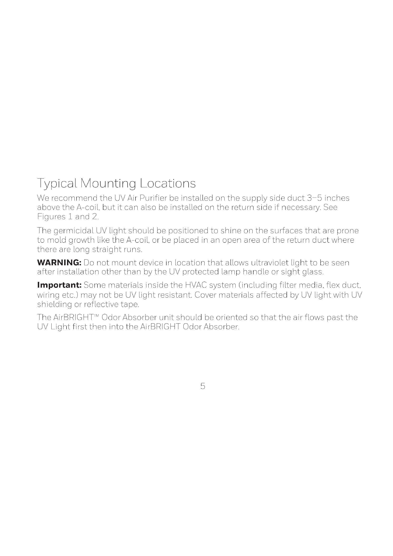 Typical Mounting Locations We recommend the UV Air Purifier be installed on the supply side duct 3–5 inches above the A-coil, but it can also be installed on the return side if necessary. See Figures 1 and 2. The germicidal UV light should be positioned to shine on the surfaces that are prone to mold growth like the A-coil, or be placed in an open area of the return duct where there are long straight runs.