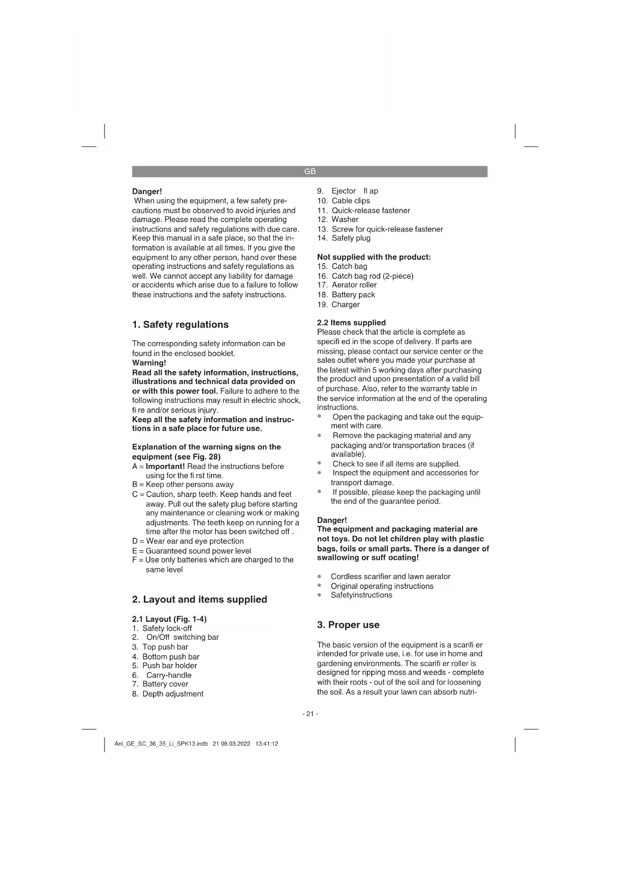 rupting or terminating your work. To prevent accidental start-up of the scarifi er, the push bar (Fig. 22/Item 3) is equipped with a safety lock-off (Fig. 22/Item 1) which must be pressed before the lever switch (Fig. 22/Item 2) can be pressed. The start time for the equipment can amount to several seconds. If the lever switch is released, the scarifi er switches off . Repeat this process several times so that you are sure that your equipment functions properly. Always pull out the safety plug before performing any adjus- ting, repair, maintenance or cleaning work on the equipment. Make sure that the spike drum is not rotating. Danger! Never open the ejector fl ap when the motor is running. A rotating cutting unit can cause injuries. Always fasten the ejector fl ap carefully. The fl ap fl ips back to the “Closed” position by the tension springs! Always ensure that a safe distance (provided by the long handles) is maintained between the user and the housing. Be especially careful when scarifying and changing direction on slopes and inclines. Maintain a solid footing and wear sturdy, non-slip footwear and long trousers. Always sca- rify along the incline (not up and down). For safety reasons, the scarifi er may not be used to scarify inclines whose gradient exceeds 15 degrees. Use special caution when backing up and pulling the scarifi er (tripping hazard)! Tips for proper working It is recommended that you overlap scarifying paths a little. Try to scarify in straight lines for a nice, clean look. Insodoing, the aeration swaths should always overlap each other by a few centimeters in order to avoid bare strips. If you use the catch bag which is available as an option, it has to be emptied as soon as grass clip- pings start to trail behind during scarifying. Danger! Before taking off the grass basket, switch off the motor and wait until the roller has come to a stop. To remove the grass basket, lift up the ejector fl ap with one hand, while unhooking the basket with the other. How frequently you should scarify your lawn is determined primarily by the speed at which the grass grows and the hardness of the soil. Keep the underside of the equipment clean and remove soil and grass build-up. Deposits make it more diffi cult to start the aerator and decrease the quality of the scarifying. Always scarify along inclines (not up and down). Switch off the motor before doing any checks on the roller. Danger! The roller rotates for a few seconds after the motor is switched off . Never attempt to stop the roller. In the event that the rotating roller strikes an object, immediately switch off the equipment and wait for the roller to come to a complete stop. Then inspect the condition of the roller. Replace any parts that are damaged (see section 7.3). Tips on aerating properly with the aerator roller available as an option. The way of working for aerating is the same as for scarifying. You should therefore observe these safety inst- ructions and notes on working practice. Anl_GE_SC_36_35_Li_SPK13.indb 25 08.03.2022 13:41:14GB
