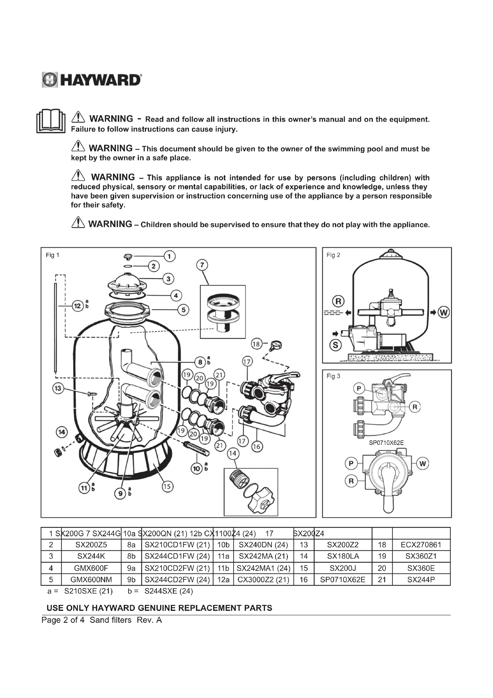 WARNING – Children should be supervised to ensure that they do not play with the appliance. SP0710X62E Fig 2 Fig 1 Fig 3 1 SX200G 7 SX244G 10a SX200QN (21) 12b CX1100Z4 (24) 17 SX200Z4 2 SX200Z5 8a SX210CD1FW (21) 10b SX240DN (24) 13 SX200Z2 18 ECX270861 3 SX244K 8b SX244CD1FW (24) 11a SX242MA (21) 14 SX180LA 19 SX360Z1 4 GMX600F 9a SX210CD2FW (21) 11b SX242MA1 (24) 15 SX200J 20 SX360E 5 GMX600NM 9b SX244CD2FW (24) 12a CX3000Z2 (21) 16 SP0710X62E 21 SX244P a = S210SXE (21) b = S244SXE (24)USE ONLY HAYWARD GENUINE REPLACEMENT PARTS Page 3 of 4 Sand filters Rev. A You have just become the owner of a sand filter, his base and his valve (see figure 1). OPERATION Your filtration system uses a special sand designed to trap impurities in the pool water. The sand is poured into the tank and acts as a permanent filtration system. The pump draws in the unfiltered pool water, which contains impurities in suspension, and feeds it to the multi-way control valve. When the water flows through the sand, the impurities are trapped there and the water that returns to your pool is filtered. INSTALLATION
