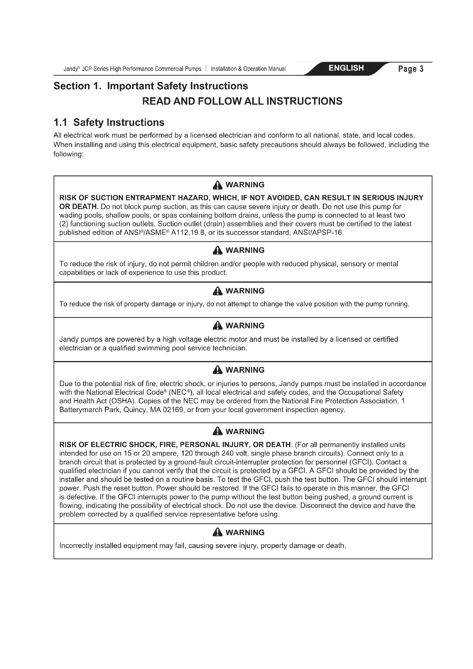 Jandy JCP Series High Performance Commercial Pumps Installation & Operation Manual WARNING RISK OF SUCTION ENTRAPMENT HAZARD, WHICH, IF NOT AVOIDED, CAN RESULT IN SERIOUS INJURY OR DEATH. Do not block pump suction, as this can cause severe injury or death. Do not use this pump for wading pools, shallow pools, or spas containing bottom drains, unless the pump is connected to at least two (2) functioning suction outlets. Suction outlet (drain) assemblies and their covers must be certified to the latest published edition of ANSI