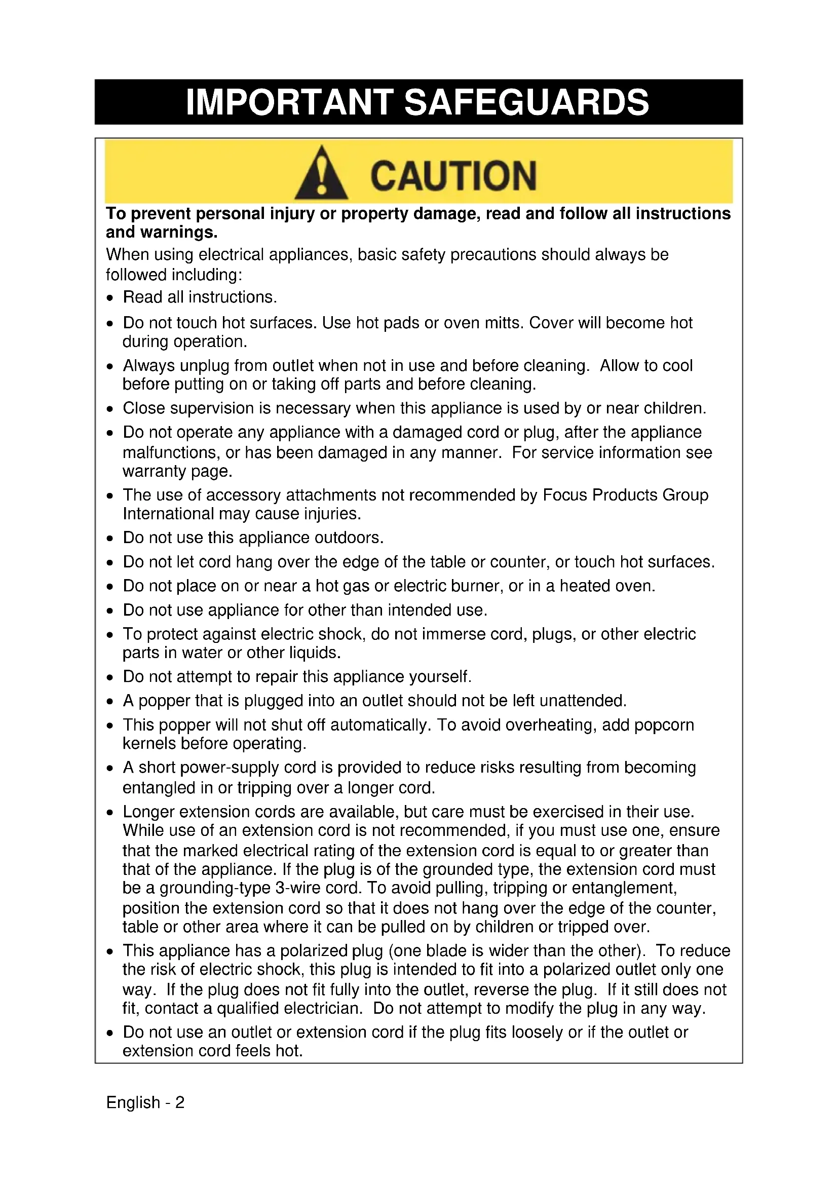 To prevent personal injury or property damage, read and follow all instructions and warnings. When using electrical appliances, basic safety precautions should always be followed including: Read all instructions. Do not touch hot surfaces. Use hot pads or oven mitts. Cover will become hot during operation. Always unplug from outlet when not in use and before cleaning. Allow to cool before putting on or taking off parts and before cleaning. Close supervision is necessary when this appliance is used by or near children. Do not operate any appliance with a damaged cord or plug, after the appliance malfunctions, or has been damaged in any manner. For service information see warranty page. The use of accessory attachments not recommended by Focus Products Group International may cause injuries. Do not use this appliance outdoors. Do not let cord hang over the edge of the table or counter, or touch hot surfaces. Do not place on or near a hot gas or electric burner, or in a heated oven. Do not use appliance for other than intended use. To protect against electric shock, do not immerse cord, plugs, or other electric parts in water or other liquids. Do not attempt to repair this appliance yourself. A popper that is plugged into an outlet should not be left unattended. This popper will not shut off automatically. To avoid overheating, add popcorn kernels before operating. A short power-supply cord is provided to reduce risks resulting from becoming entangled in or tripping over a longer cord. Longer extension cords are available, but care must be exercised in their use. While use of an extension cord is not recommended, if you must use one, ensure that the marked electrical rating of the extension cord is equal to or greater than that of the appliance. If the plug is of the grounded type, the extension cord must be a grounding-type 3-wire cord. To avoid pulling, tripping or entanglement, position the extension cord so that it does not hang over the edge of the counter, table or other area where it can be pulled on by children or tripped over. This appliance has a polarized plug (one blade is wider than the other). To reduce the risk of electric shock, this plug is intended to fit into a polarized outlet only one way. If the plug does not fit fully into the outlet, reverse the plug. If it still does not fit, contact a qualified electrician. Do not attempt to modify the plug in any way. Do not use an outlet or extension cord if the plug fits loosely or if the outlet or extension cord feels hot.English - 3 During use, do not remove cover. Do not remove cover from the appliance until you have not heard a kernel pop for at least 1 minute. For household use only.