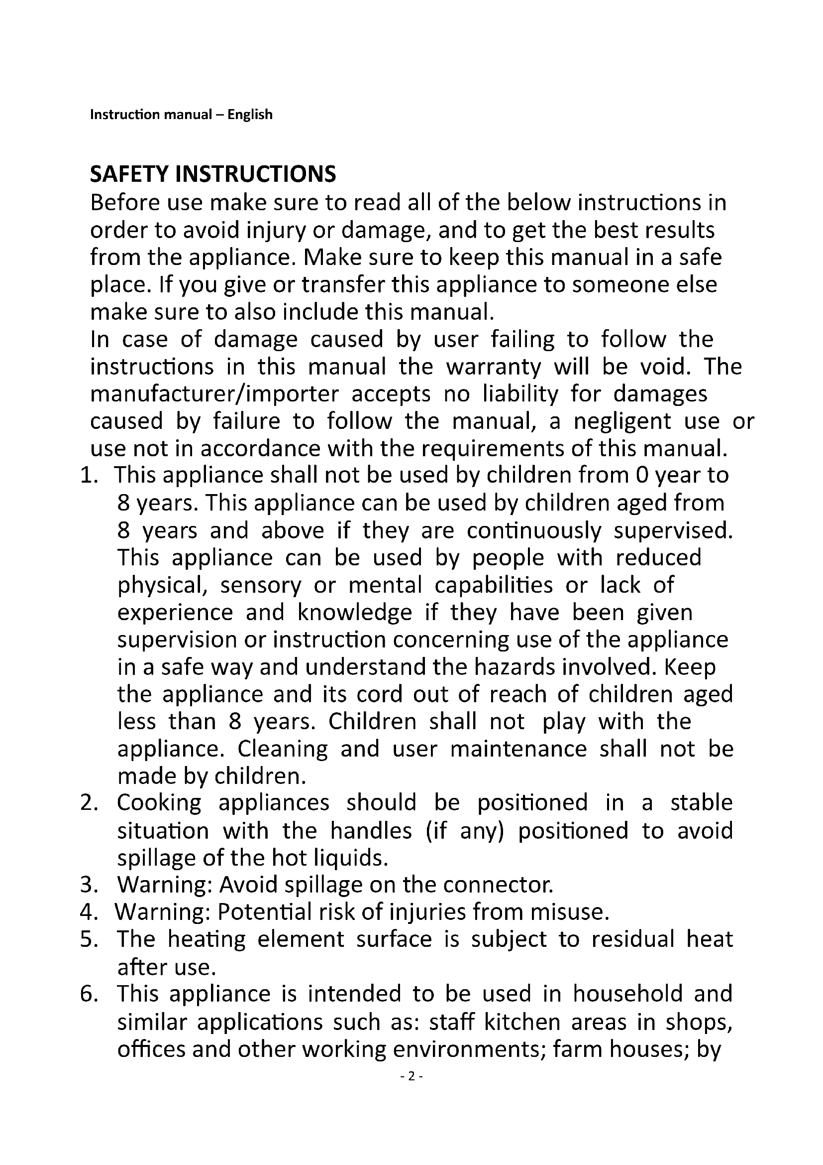 Before delivery our devices are subjected to rigorous quality control. If, despite all care, damage has occurred during production or transportation, please return the device to your dealer. In addition to statutory legal rights, the purchaser has an option to claim under the terms of the following guarantee: For the purchased device we provide 2 years guarantee, commencing from the day of sale. If you have a defective product, you can directly go back to the point of purchase. Defects which arise due to improper handling of the device and malfunctions due to interventions and repairs- 7 - by third parties or the fitting of non-original parts are not covered by this guarantee. Always keep your receipt, without the receipt you can’t claim any form of warranty. Damage caused by not following the instruction manual, will lead to a void of warranty, if this results in consequential damages then we will not be liable. Neither can we hold responsible for material damage or personal injury caused by improper use or if the instruction manual are not properly executed. Damage to accessories does not mean free replacement of the whole appliance. In such case please contact our service department. Broken glass or breakage of plastic parts is always subject to a charge. Defects to consumables or parts subjected to wearing, as well as cleaning, maintenance or the replacement of said parts are not covered by the warranty and are to be paid.