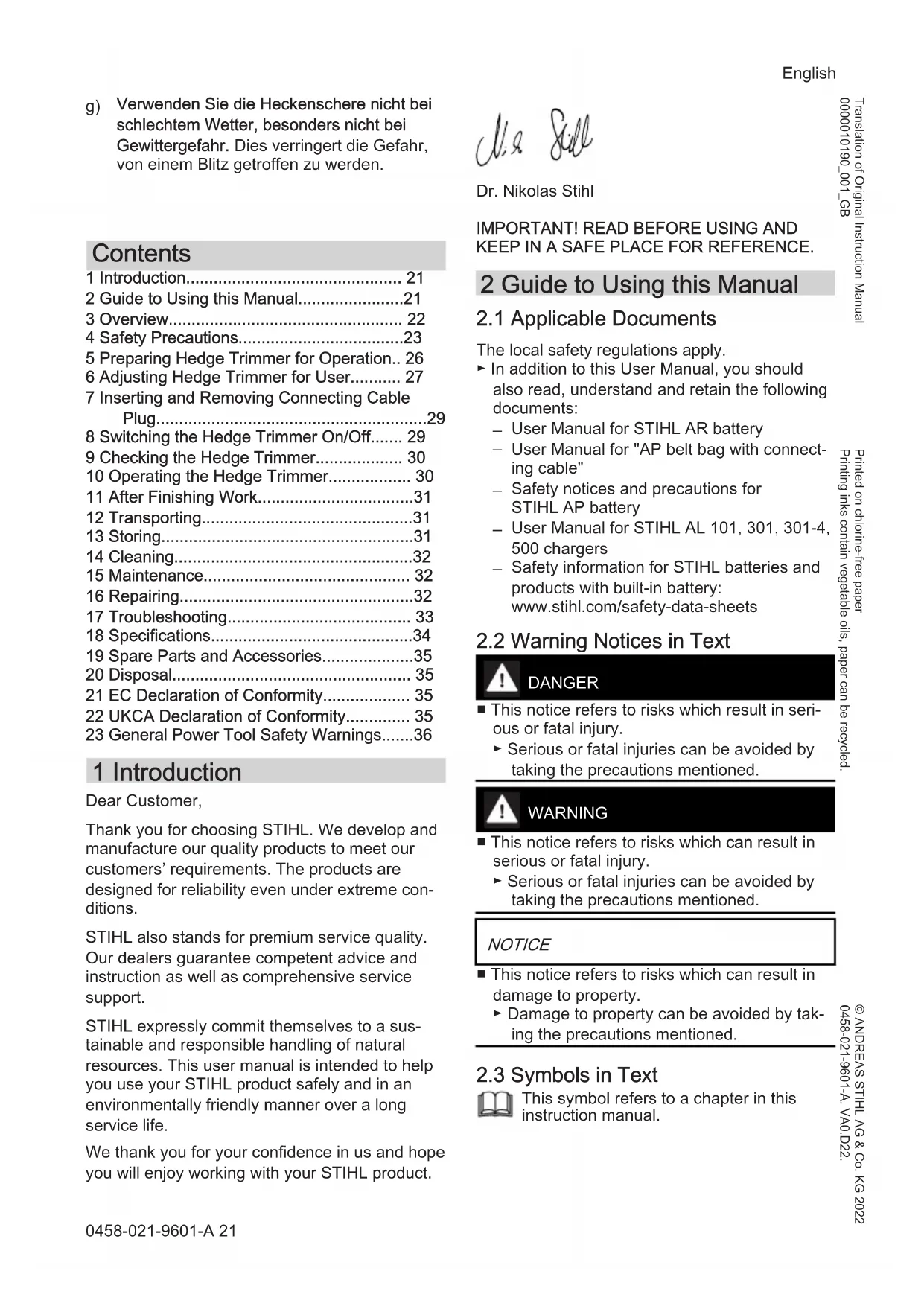 This symbol refers to a chapter in this instruction manual. English 0458-021-9601-A 21 © ANDREAS STIHL AG & Co. KG 2022 0458-021-9601-A. VA0.D22. Printed on chlorine-free paper Printing inks contain vegetable oils, paper can be recycled. Translation of Original Instruction Manual 0000010190_001_GB3 Overview