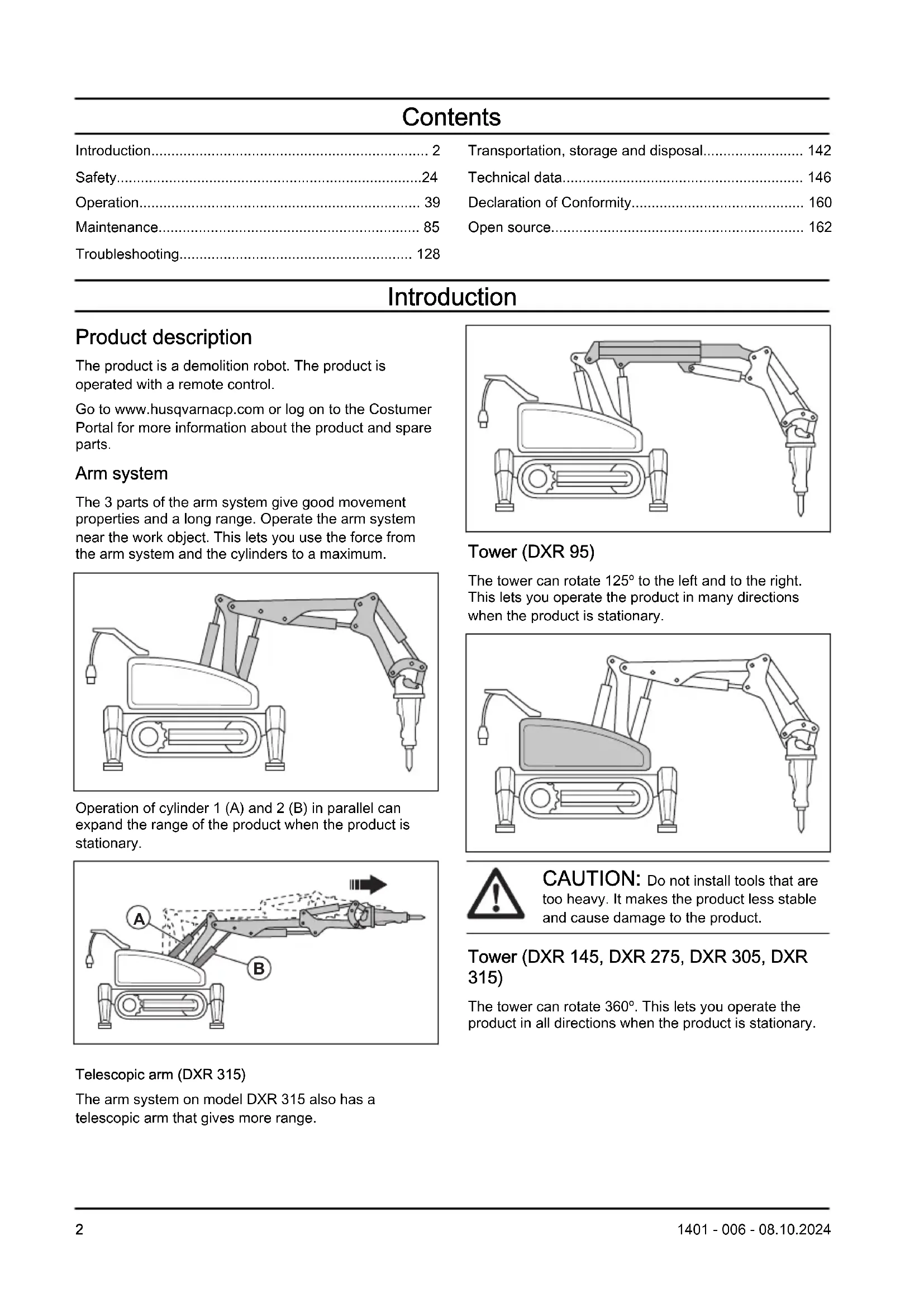 Partille, 2023-06-16 Fredrik Linnell Light Demolition Director Husqvarna AB, Construction Division Responsible for technical documentation 160 1401 - 006 - 08.10.2024UK Declaration of Conformity We Husqvarna AB, SE-561 82 Huskvarna, Sweden, tel: +46- 36-146500, declares on our sole responsibility that the product: Description Demolition Robot Brand Husqvarna Type/Model DXR 95, DXR 145, DXR 275, DXR 305, DXR 315 Identification Serial numbers dating from 2023 and onwards complies fully with the following UK regulations: The Supply of Machinery (Safety) Regulations 2008 The Radio Equipment Regulations 2017 The Noise Emission in the Environment by Equipment for use Outdoors Regulations 2001 and that the following standards and/or technical specifications are applied; EN ISO 12100:2010