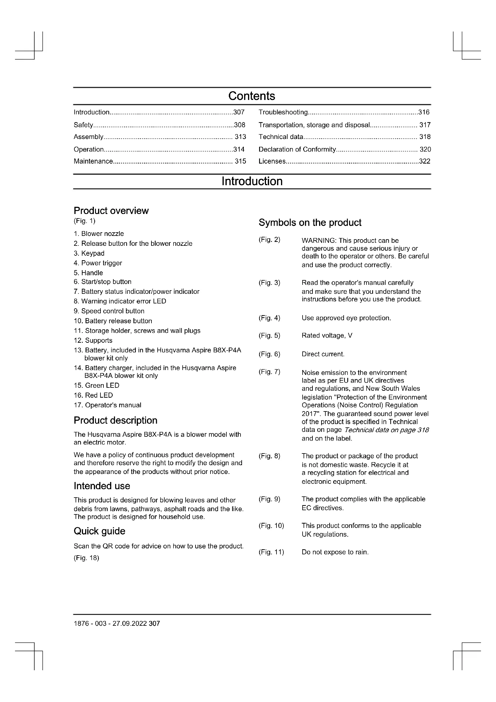 dangerous and cause serious injury or death to the operator or others. Be careful and use the product correctly. (Fig. 3) Read the operator's manual carefully and make sure that you understand the instructions before you use the product. (Fig. 4) Use approved eye protection. (Fig. 5) Rated voltage, V (Fig. 6) Direct current. (Fig. 7) Noise emission to the environment label as per EU and UK directives and regulations, and New South Wales legislation "Protection of the Environment Operations (Noise Control) Regulation 2017". The guaranteed sound power level of the product is specified in Technical data on page Technical data on page 318 and on the label. (Fig. 8) The product or package of the product is not domestic waste. Recycle it at a recycling station for electrical and electronic equipment. (Fig. 9) The product complies with the applicable EC directives. (Fig. 10) This product conforms to the applicable UK regulations. (Fig. 11) Do not expose to rain. 1876 - 003 - 27.09.2022 307(Fig. 15) The blower operator must ensure that no people or animals come closer than 15 metres. When several operators are working at the same site a safety distance of at least 15 metres must be in effect. The blower can forcibly throw objects that can bounce back. This can result in serious eye injuries if the recommended safety equipment is not used. yyyy wwxxxxx The rating plate shows serial number. yyyy is the production year, ww is the production week. Note: Other symbols/decals on the product refer to special certification requirements for certain markets. Symbols on the battery and/or on the battery charger (Fig. 16) Recycle this product at a recycling sta- tion for electrical and electronic equipment. (Applies to Europe only) (Fig. 17) Use the battery on- ly in products from