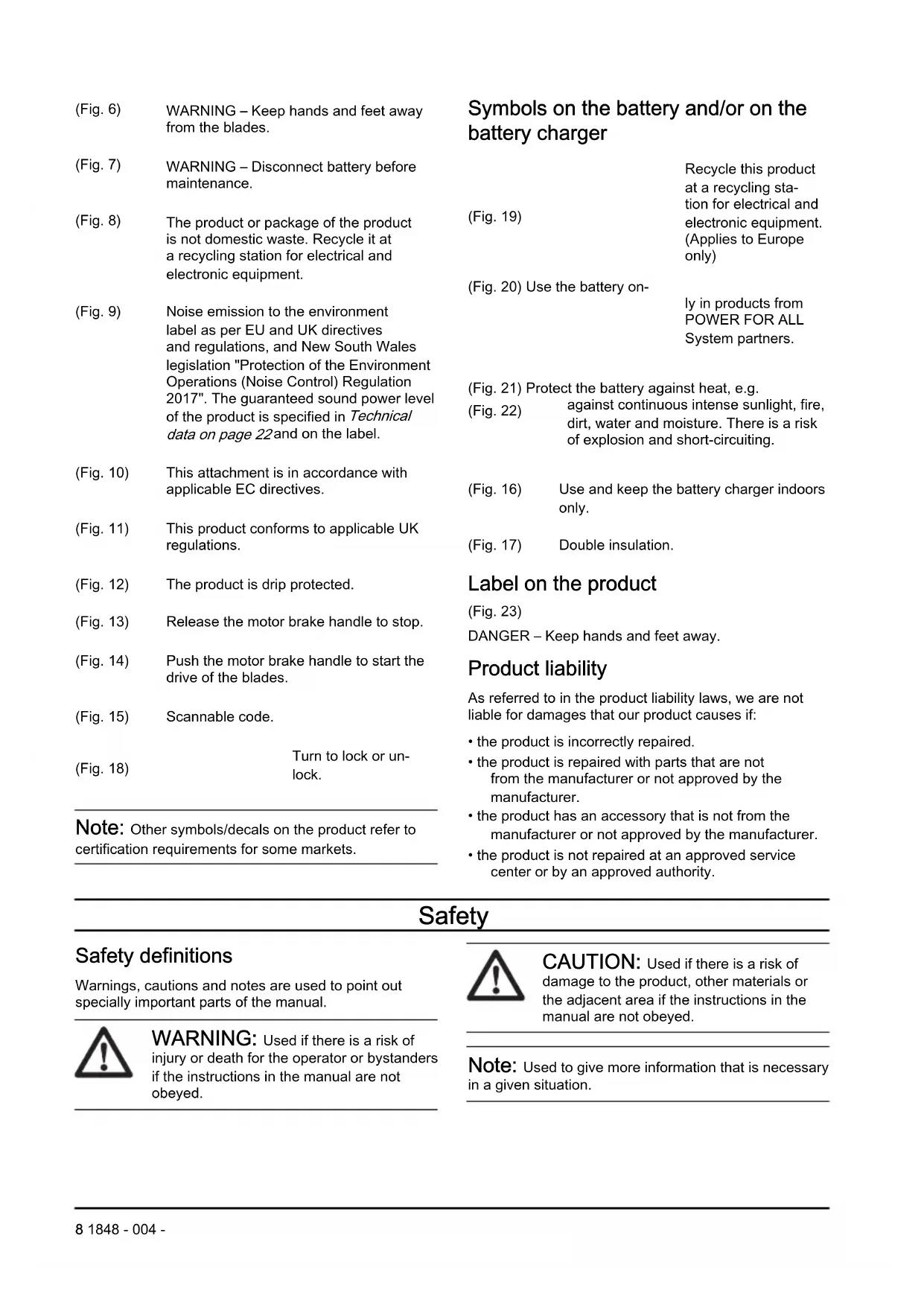 Symbols on the product (Fig. 2) WARNING (Fig. 3) Read the instructions. (Fig. 4) WARNING - Beware of thrown objects. (Fig. 5) Keep bystanders away. 1848 - 004 - 7(Fig. 6) WARNING – Keep hands and feet away from the blades. (Fig. 7) WARNING – Disconnect battery before maintenance. (Fig. 8) The product or package of the product is not domestic waste. Recycle it at a recycling station for electrical and electronic equipment. (Fig. 9) Noise emission to the environment label as per EU and UK directives and regulations, and New South Wales legislation "Protection of the Environment Operations (Noise Control) Regulation 2017". The guaranteed sound power level of the product is specified in Technical data on page 22 and on the label. (Fig. 10) This attachment is in accordance with applicable EC directives. (Fig. 11) This product conforms to applicable UK regulations. (Fig. 12) The product is drip protected. (Fig. 13) Release the motor brake handle to stop. (Fig. 14) Push the motor brake handle to start the drive of the blades. (Fig. 15) Scannable code. (Fig. 18) Turn to lock or un- lock. Note: Other symbols/decals on the product refer to certification requirements for some markets. Symbols on the battery and/or on the battery charger (Fig. 19) Recycle this product at a recycling sta- tion for electrical and electronic equipment. (Applies to Europe only) (Fig. 20) Use the battery on- ly in products from