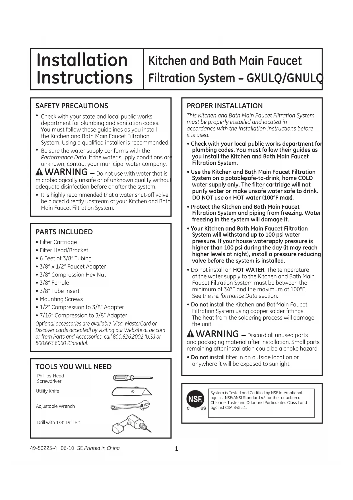 Installation Kitchen and Bath Main Faucet Instructions Filtration System – GXULQ/GNULQ SAFETY PRECAUTIONS