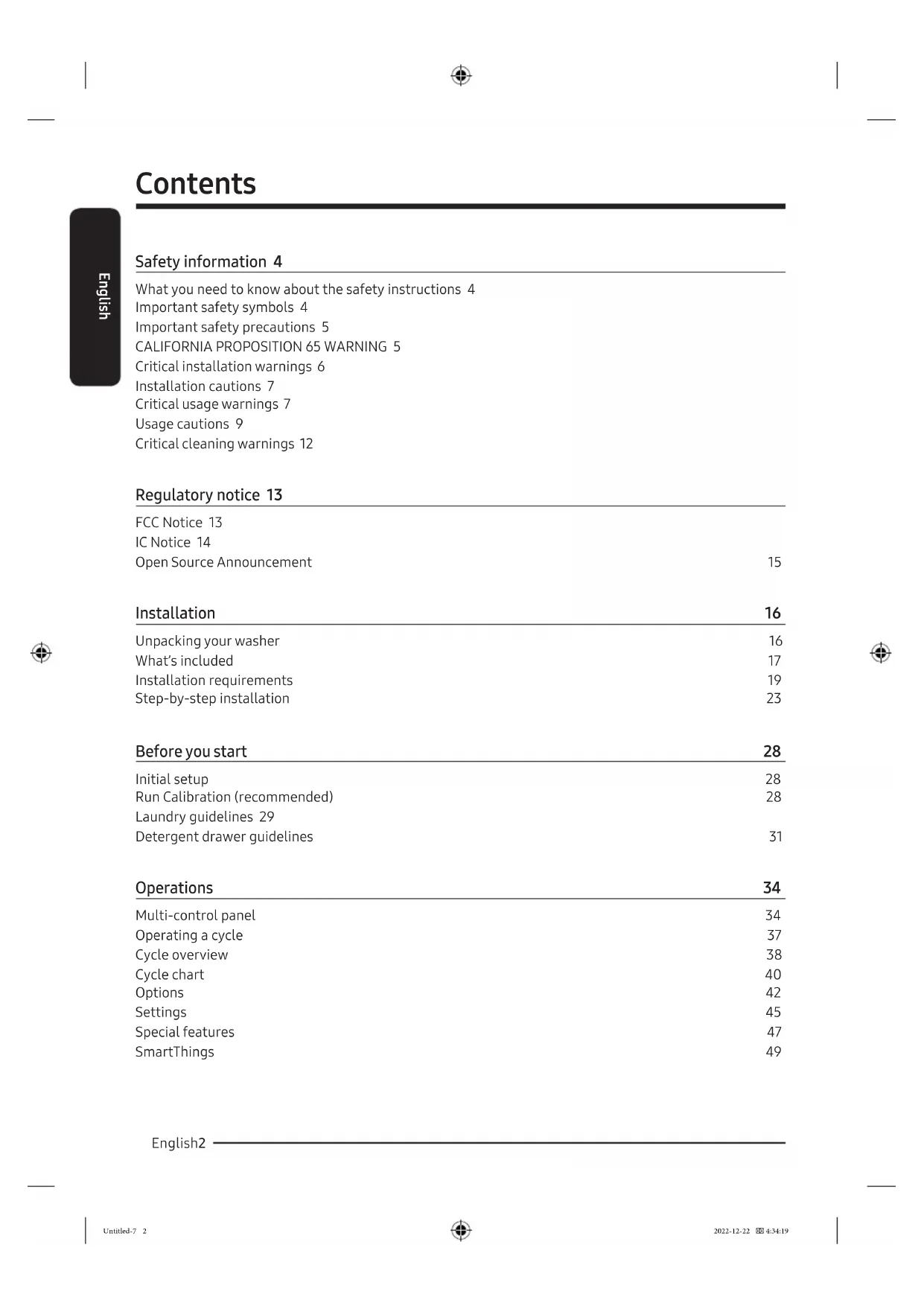 Critical installation warnings 6 Installation cautions 7 Critical usage warnings 7 Usage cautions 9 Critical cleaning warnings 12 Regulatory notice 13 FCC Notice 13 IC Notice 14 Open Source Announcement 15 Installation 16 Unpacking your washer 16 What’s included 17 Installation requirements 19 Step-by-step installation 23 Before you start 28 Initial setup 28 Run Calibration (recommended) 28 Laundry guidelines 29 Detergent drawer guidelines 31 Operations 34 Multi-control panel 34 Operating a cycle 37 Cycle overview 38 Cycle chart 40 Options 42 Settings 45 Special features 47 SmartThings 49 Untitled-7 2 2022-12-22 4:34:19English English 3 Maintenance 50 Self Clean+ 50 Emergency drain 51 Cleaning 52 Recovery from freezing 56 Care for an extended period of non-use 56 Cleaning the exterior 57 Cleaning the interior 57 Troubleshooting 58 Checkpoints 58 Information codes 63 Specifications 65 Fabric care chart 65 Protecting the environment 66 Declaration of conformity 66 Specification sheet 67 Untitled-7 3 2022-12-22 4:34:19English