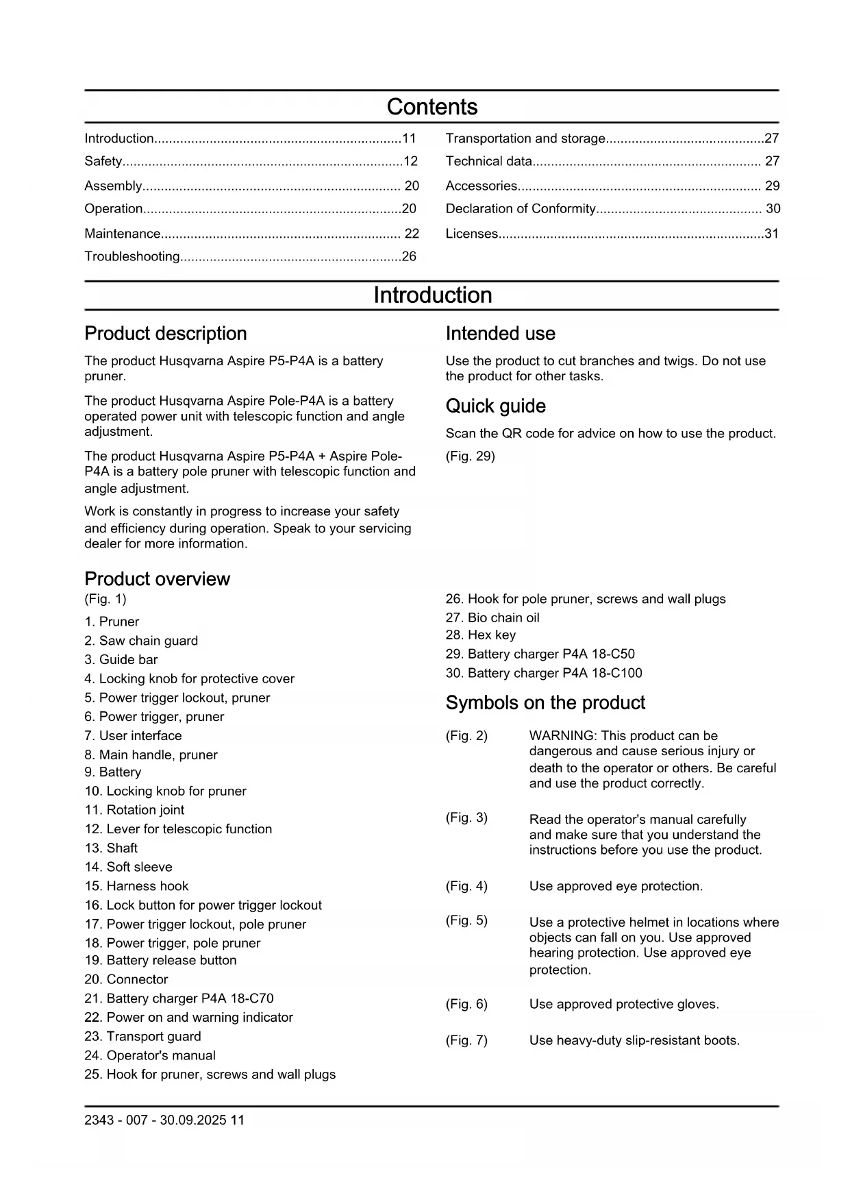 dangerous and cause serious injury or death to the operator or others. Be careful and use the product correctly. (Fig. 3) Read the operator's manual carefully and make sure that you understand the instructions before you use the product. (Fig. 4) Use approved eye protection. (Fig. 5) Use a protective helmet in locations where objects can fall on you. Use approved hearing protection. Use approved eye protection. (Fig. 6) Use approved protective gloves. (Fig. 7) Use heavy-duty slip-resistant boots. 2343 - 007 - 30.09.2025 11(Fig. 8) Direct current. (Fig. 9) Rated voltage, V (Fig. 10) Do not expose to rain. (Fig. 11) Chain oil fill. (Fig. 12) Direction of rotation, saw chain. (Fig. 13) Risk of injury. Keep hands away from saw chain. (Fig. 14) Turn left to loose the knob, turn right to tighten the knob. (Fig. 15) The product complies with the applicable EU directives. (Fig. 16) Noise emission to the environment label as per EU, and New South Wales legislation "Protection of the Environment Operations (Noise Control) Regulation 2017". The guaranteed sound power level of the product is specified in Technical data on page Technical data on page 27 and on the label. (Fig. 17) The product or package of the product is not domestic waste. Recycle it at a recycling station for electrical and electronic equipment. (Fig. 18) DANGER - Keep sufficient distance away from electrical power lines (Fig. 19) Keep persons and animals at a safe distance from the work area and the product (Fig. 20) WARNING - Disconnect the battery before maintence (Fig. 24) The rating plate shows serial number. yyyy is the production year, ww, and xxxxx is the sequential number. Note: Other symbols/decals on the product refer to special certification requirements for certain markets. Symbols on the battery and/or on the battery charger (Fig. 21) Fail-safe transformer. (Fig. 22) Use and keep the battery charger indoors only. (Fig. 23) Double insulation. (Fig. 25) Recycle this product at a recycling station for electrical and electronic equipment. (Ap- plies to Europe only) (Fig. 26) Use the battery only in products from POW- ER FOR ALL System partners. (Fig. 27) Protect the battery against heat, e.g. against continuous intense sunlight, fire, dirt, water and moisture. There is a risk of explosion and short-circuiting. (Fig. 28) Product damage We are not responsible for damages to our product if: