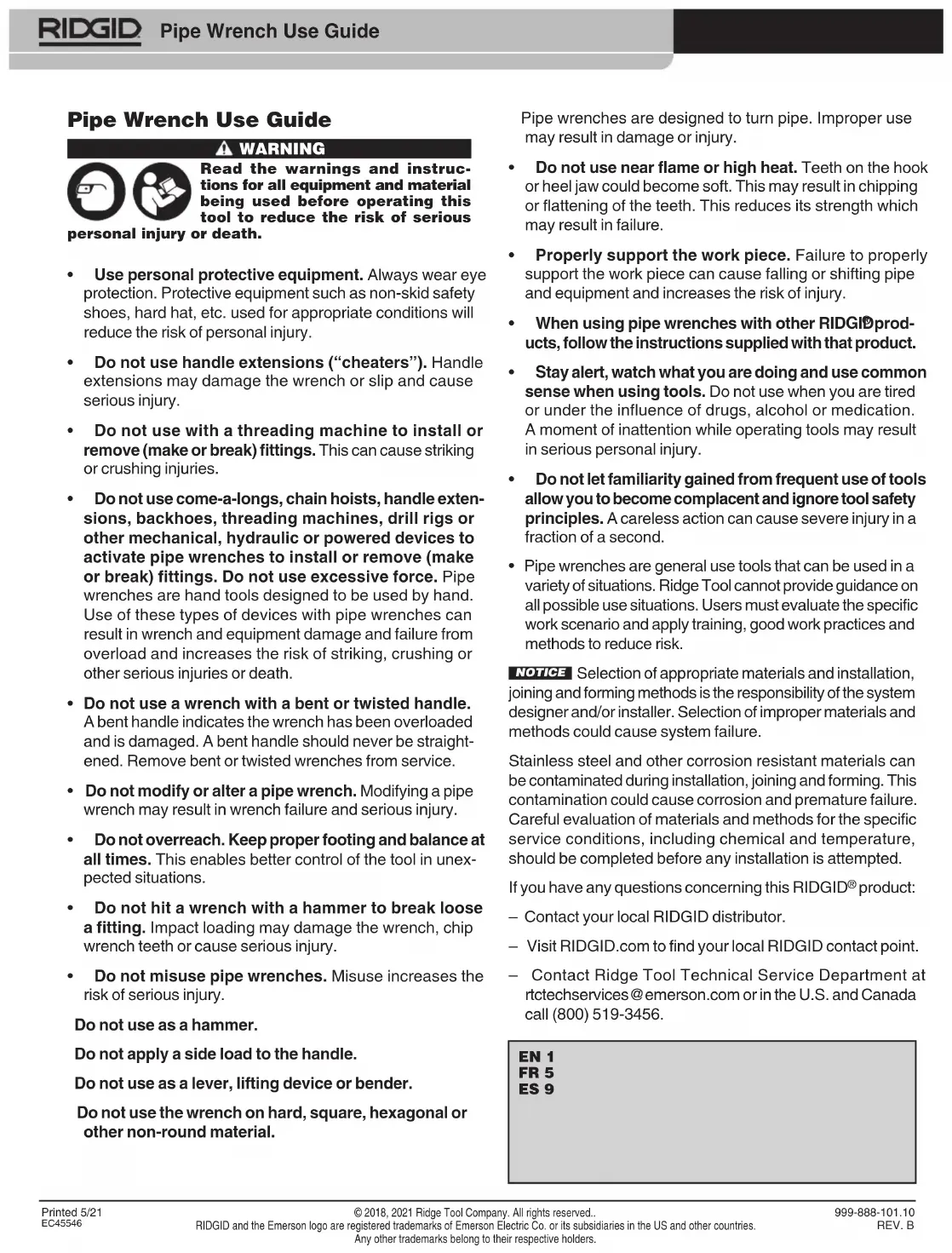 product: – Contact your local RIDGID distributor. – Visit RIDGID.com to find your local RIDGID contact point. – Contact Ridge Tool Technical Service Department at rtctechservices@emerson.com or in the U.S. and Canada call (800) 519-3456. Printed 5/21EC45546999-888-101.10 REV. B© 2018, 2021 Ridge Tool Company. All rights reserved.. RIDGID and the Emerson logo are registered trademarks of Emerson Electric Co. or its subsidiaries in the US and other countries. Any other trademarks belong to their respective holders. EN 1 FR 5