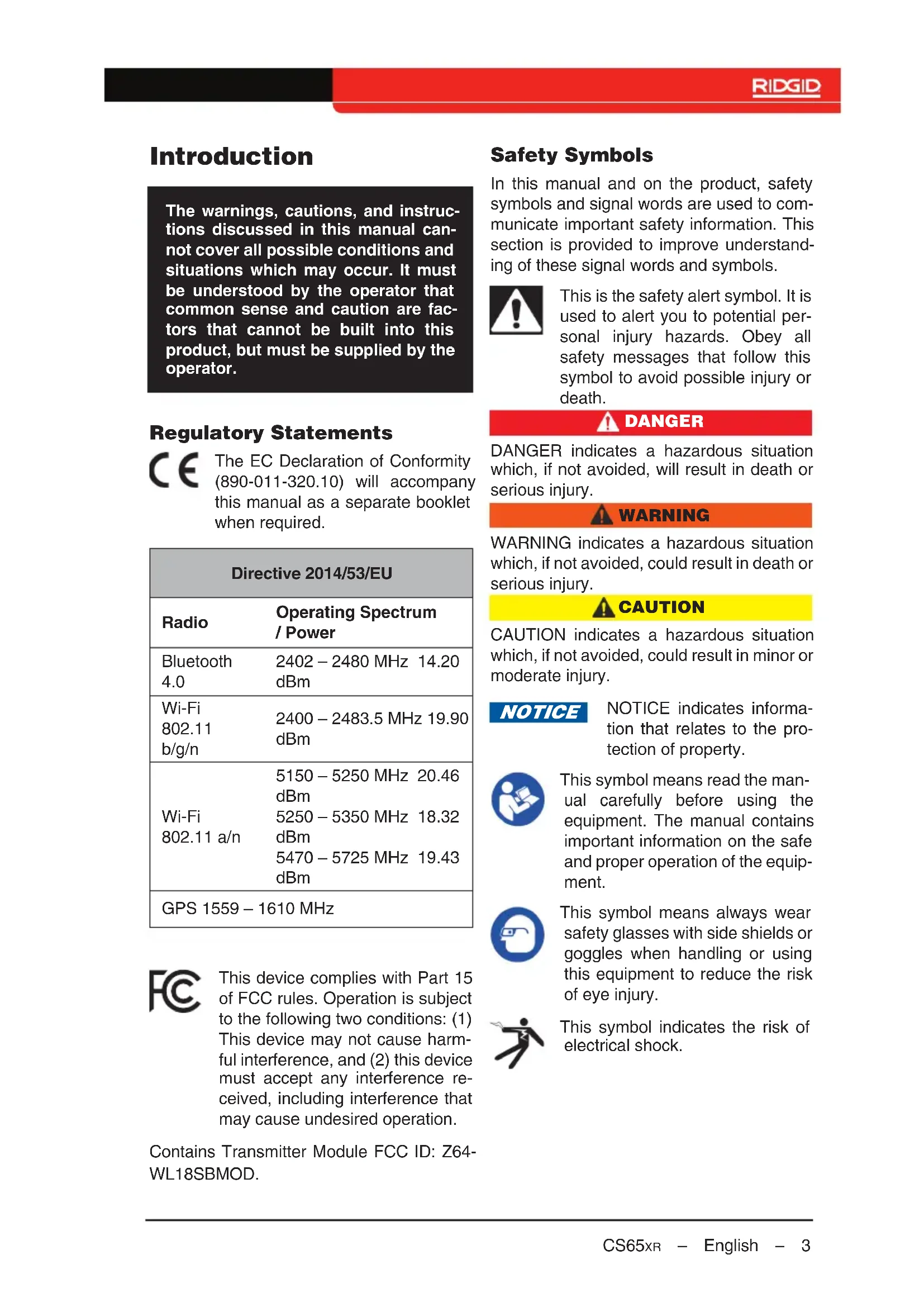 5150 – 5250 MHz 20.46 dBm 5250 – 5350 MHz 18.32 dBm 5470 – 5725 MHz 19.43 dBm GPS 1559 – 1610 MHz This device complies with Part 15 of FCC rules. Operation is subject to the following two conditions: (1) This device may not cause harm- ful interference, and (2) this device must accept any interference re- ceived, including interference that may cause undesired operation. Contains Transmitter Module FCC ID: Z64- WL18SBMOD. Safety Symbols In this manual and on the product, safety symbols and signal words are used to com- municate important safety information. This section is provided to improve understand- ing of these signal words and symbols. This is the safety alert symbol. It is used to alert you to potential per- sonal injury hazards. Obey all safety messages that follow this symbol to avoid possible injury or death. DANGER DANGER indicates a hazardous situation which, if not avoided, will result in death or serious injury. WARNING WARNING indicates a hazardous situation which, if not avoided, could result in death or serious injury. CAUTION CAUTION indicates a hazardous situation which, if not avoided, could result in minor or moderate injury. NOTICE NOTICE indicates informa- tion that relates to the pro- tection of property. This symbol means read the man- ual carefully before using the equipment. The manual contains important information on the safe and proper operation of the equip- ment. This symbol means always wear safety glasses with side shields or goggles when handling or using this equipment to reduce the risk of eye injury. This symbol indicates the risk of electrical shock.4 – English – CS65xr