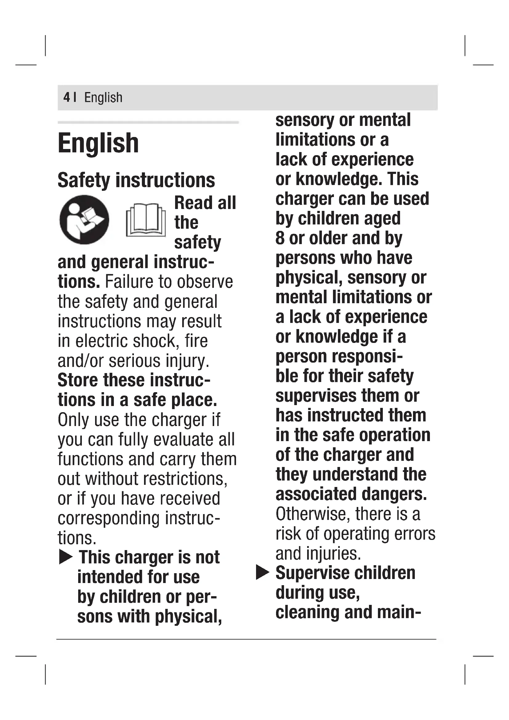 voltage must match the battery charging voltage of the char- ger. Do not charge any non-rechar- geable batteries. Otherwise there is a risk of fire and ex- plosion. Only use the charger in enclo- sed spaces and do not expose it to wet condi- tions. Water entering a charger increases the risk of electric shock. u Keep the charger clean. Dirt poses a risk of electric shock. u Always check the charge, including the cable and plug, before use. Stop using the charger if you discover any damage. Do not open the charger yourself, and have it repaired only by Husqvarna or by an authorised after-sales service centre using only original repla- cement parts. Dama- ged chargers, cables and plugs increase the risk of electric shock. u Do not operate the charger on an easily ignited sur- face (e.g. paper, textiles, etc.) or in English6 | a flammable envi- ronment. There is a risk of fire due to the charger heating up during operation. u Do not cover the ventilation slots of the charger. Ot- herwise, the charger may overheat and no longer function pro- perly. u Recharge only with the charger specified by the ma- nufacturer. A charger that is suitable for one type of battery pack may create a risk of fire when used with another battery pack. u In case of damage and improper use of the battery, vapours may also be emitted. Ensure the area is well-ventila- ted and seek medical attention should you experience any adverse effects. The vapours may irritate the respiratory system. u Under abusive conditions, liquid may be ejected from the battery; avoid contact. If contact accidentally occurs, flush with water. If liquid contacts eyes, additionally seek medical help. Liquid ejected from the battery may cause irritation or burns. Products sold in GB only: Your product is fitted with an BS 1363/A approved electric plug with internal fuse (ASTA approved to BS 1362). If the plug is not suitable for your socket outlets, it should be cut off and an appropriate plug fitted in English| 7 its place by an authorised custo- mer service agent. The replace- ment plug should have the same fuse rating as the original plug. The severed plug must be disposed of to avoid a possible shock hazard and should never be inserted into a mains socket elsewhere. Product description and specifications Intended use The battery charger is intended for charging the rechargeable 18V POWER FOR ALL system batteries. Product Features (1) Red temperature monitoring/ error indicator (2) Green battery charge indicator (3) Charging slot Technical Data Battery charger P4A 18- C70 Protection class / II Charging current