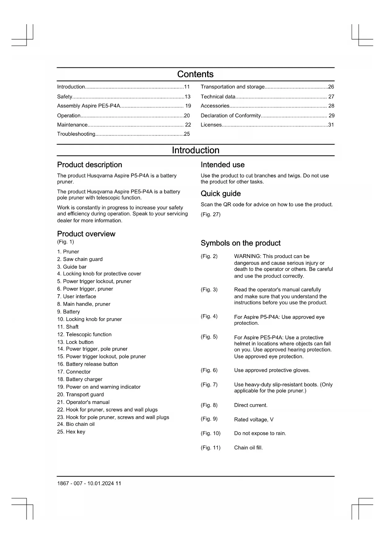 dangerous and cause serious injury or death to the operator or others. Be careful and use the product correctly. (Fig. 3) Read the operator's manual carefully and make sure that you understand the instructions before you use the product. (Fig. 4) For Aspire P5-P4A: Use approved eye protection. (Fig. 5) For Aspire PE5-P4A: Use a protective helmet in locations where objects can fall on you. Use approved hearing protection. Use approved eye protection. (Fig. 6) Use approved protective gloves. (Fig. 7) Use heavy-duty slip-resistant boots. (Only applicable for the pole pruner.) (Fig. 8) Direct current. (Fig. 9) Rated voltage, V (Fig. 10) Do not expose to rain. (Fig. 11) Chain oil fill. 1867 - 007 - 10.01.2024 11(Fig. 12) Direction of rotation, saw chain. (Fig. 13) Risk of injury. Keep hands away from saw chain. (Fig. 14) Turn left to loose the knob, turn right to tighten the knob. (Fig. 15) The product complies with the applicable EU directives. (Fig. 16) This product conforms to the applicable UK regulations. (Fig. 17) Noise emission to the environment label as per EU and UK directives and regulations, and New South Wales legislation "Protection of the Environment Operations (Noise Control) Regulation 2017". The guaranteed sound power level of the product is specified in Technical data on page Technical data on page 27 and on the label. (Fig. 18) The product or package of the product is not domestic waste. Recycle it at a recycling station for electrical and electronic equipment. (Fig. 21) This product is not electrically insulated. If the product touches or comes close to high-voltage power lines it could lead to death or serious injury. Electricity can jump from one point to another by arcing. The higher the voltage, the greater the distance electricity can jump. Electricity can also travel through branches and other objects, especially if they are wet. Always keep a distance of at least 10 m between the product and high-voltage power lines and/or any objects that are touching them. If you have to work within this safe distance you should always contact the relevant power company to make sure the power is switched off before you start work. The operator of the product must ensure, while working, that no persons or animals come closer than 15 meters. (Only applicable for the pole pruner.) (Fig. 22) The rating plate or the laser printing shows the serial number. yyyy is the produc- tion year and ww is the production week. Note: Other symbols/decals on the product refer to special certification requirements for certain markets. Symbols on the battery and/or on the battery charger (Fig. 23) Recycle this product at a recycling sta- tion for electrical and electronic equipment. (Applies to Europe only) (Fig. 24) Use the battery on- ly in products from