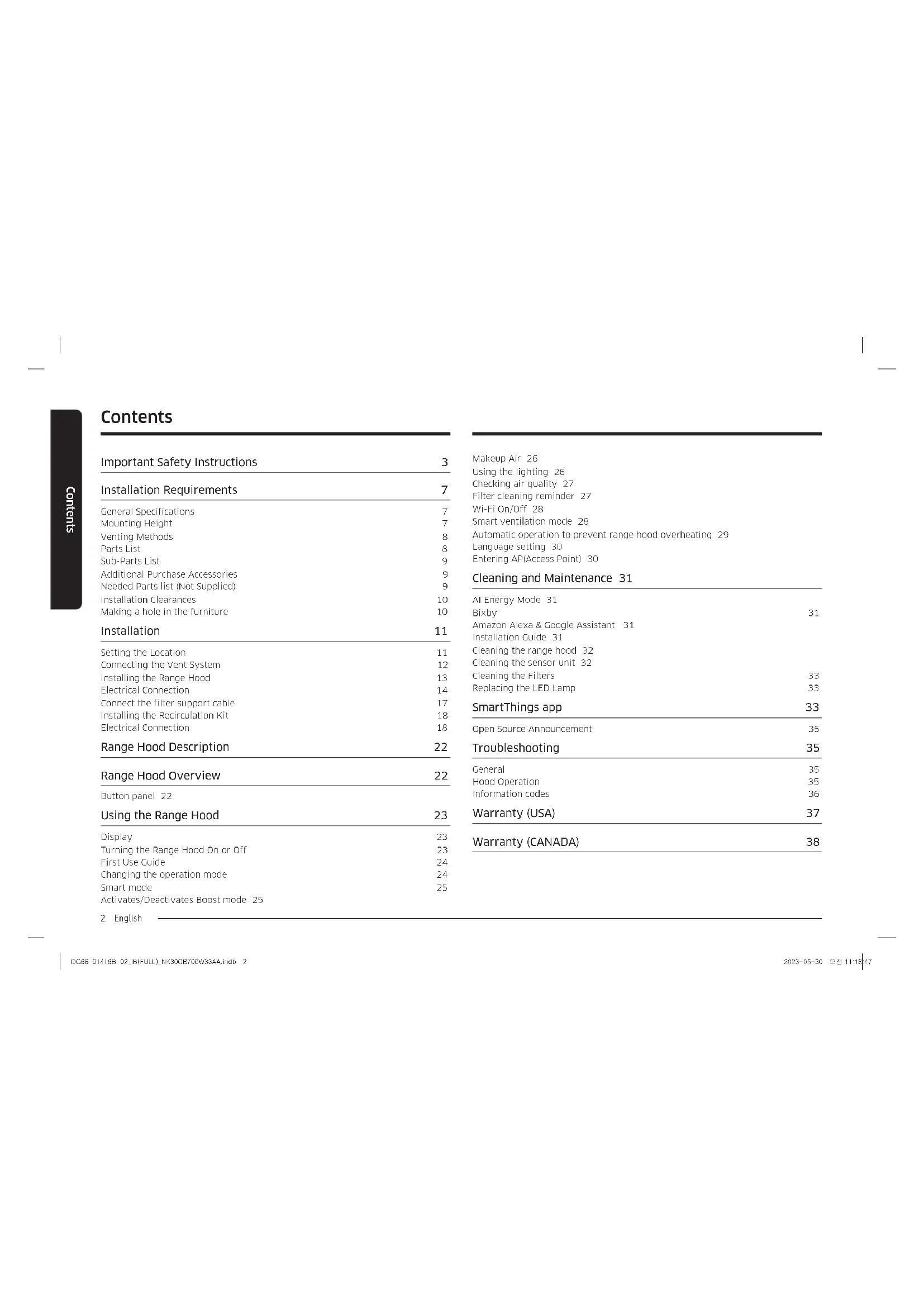 Makeup Air 26 Using the lighting 26 Checking air quality 27 Filter cleaning reminder 27 Wi-Fi On/Off 28 Smart ventilation mode 28 Automatic operation to prevent range hood overheating 29 Language setting 30 Entering AP(Access Point) 30 Cleaning and Maintenance 31 AI Energy Mode 31 Bixby 31 Amazon Alexa & Google Assistant 31 Installation Guide 31 Cleaning the range hood 32 Cleaning the sensor unit 32 Cleaning the Filters 33 Replacing the LED Lamp 33 SmartThings app 33 Open Source Announcement 35 Troubleshooting 35 General 35 Hood Operation 35 Information codes 36 Warranty (USA) 37 Warranty (CANADA) 38 Contents Important Safety Instructions 3 Installation Requirements 7 General Specifications 7 Mounting Height 7 Venting Methods 8 Parts List 8 Sub-Parts List 9 Additional Purchase Accessories 9 Needed Parts list (Not Supplied) 9 Installation Clearances 10 Making a hole in the furniture 10 Installation 11 Setting the Location 11 Connecting the Vent System 12 Installing the Range Hood 13 Electrical Connection 14 Connect the filter support cable 17 Installing the Recirculation Kit 18 Electrical Connection 18 Range Hood Description 22 Range Hood Overview 22 Button panel 22 Using the Range Hood 23 Display 23 Turning the Range Hood On or Off 23 First Use Guide 24 Changing the operation mode 24 Smart mode 25 Activates/Deactivates Boost mode 25 DG68-01416B-02_IB(FULL)_NK30CB700W33AA.indb 2DG68-01416B-02_IB(FULL)_NK30CB700W33AA.indb 2 2023-05-30 오전 11:18:472023-05-30 오전 11:18:47English 3 Important Safety Instructions