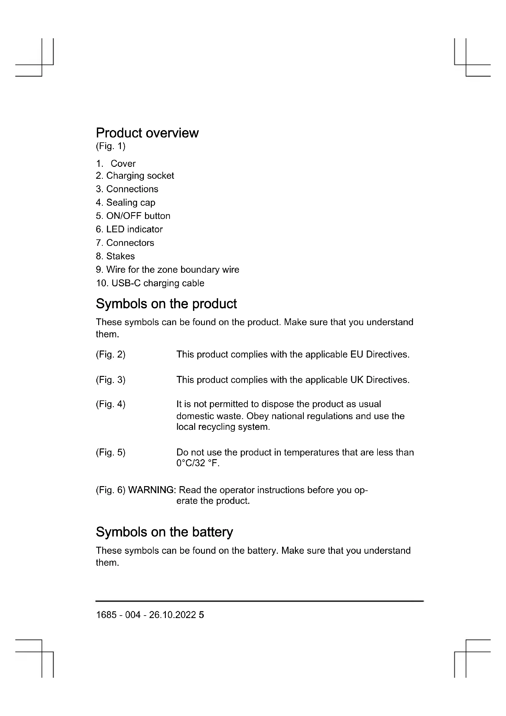 Symbols on the product These symbols can be found on the product. Make sure that you understand them. (Fig. 2) This product complies with the applicable EU Directives. (Fig. 3) This product complies with the applicable UK Directives. (Fig. 4) It is not permitted to dispose the product as usual domestic waste. Obey national regulations and use the local recycling system. (Fig. 5) Do not use the product in temperatures that are less than 0°C/32 °F. (Fig. 6) WARNING: Read the operator instructions before you op- erate the product. Symbols on the battery These symbols can be found on the battery. Make sure that you understand them. 1685 - 004 - 26.10.2022 5(Fig. 7) WARNING: Do not dispose the battery as usual domestic waste. The battery contains lithium-ion cells. Safety Safety definitions Warnings, cautions and notes are used to point out specially important parts of the manual.
