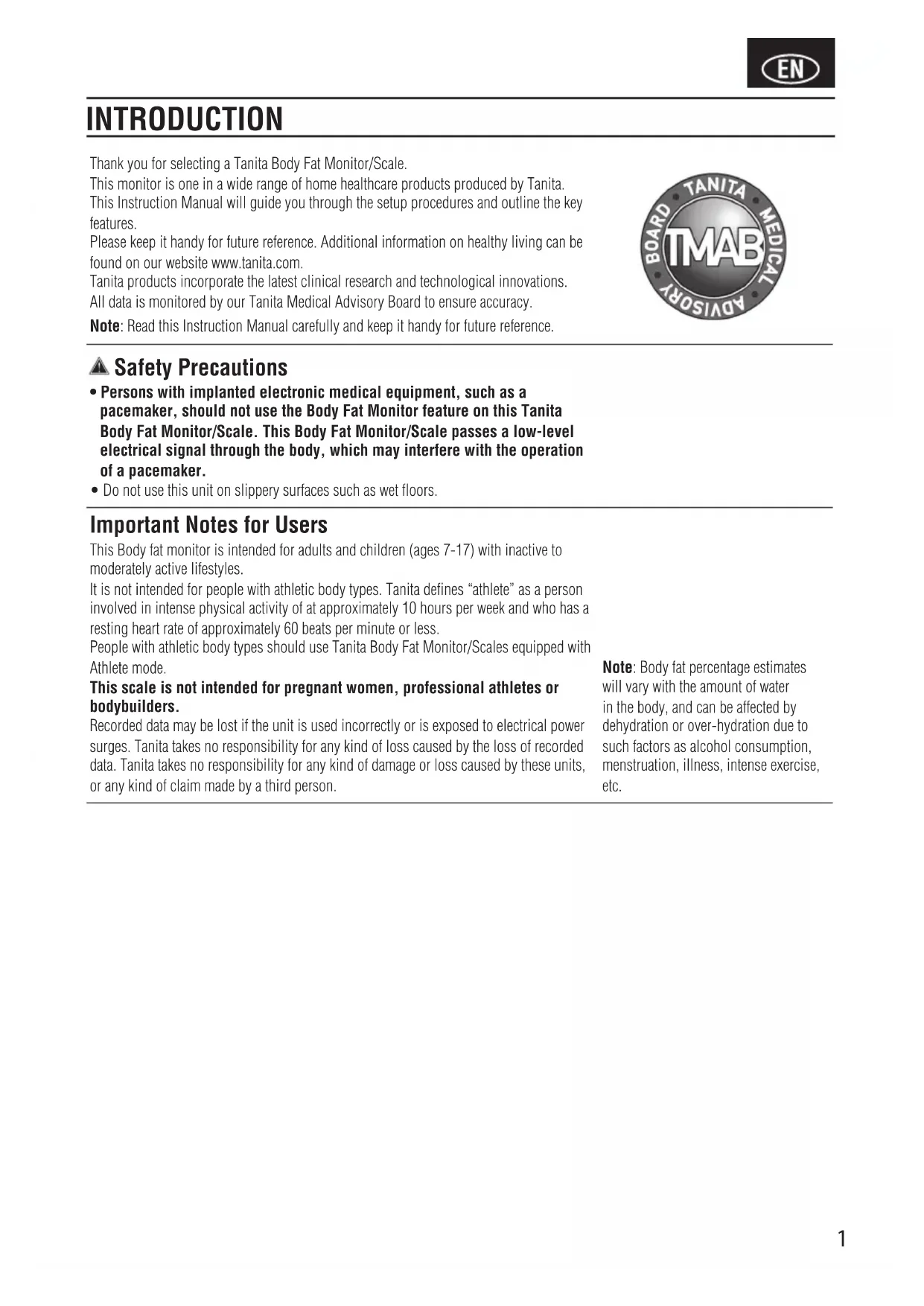 - Do not use this unit on slippery surfaces such as wet floors. Important Notes for Users This Body fat monitor is intended for adults and children (ages 7-17) with inactive to moderately active lifestyles. It is not intended for people with athletic body types. Tanita defines “athlete” as a person involved in intense physical activity of at approximately 10 hours per week and who has a resting heart rate of approximately 60 beats per minute or less. People with athletic body types should use Tanita Body Fat Monitor/Scales equipped with Athlete mode. This scale is not intended for pregnant women, professional athletes or bodybuilders. Recorded data may be lost if the unit is used incorrectly or is exposed to electrical power surges. Tanita takes no responsibility for any kind of loss caused by the loss of recorded data. Tanita takes no responsibility for any kind of damage or loss caused by these units, or any kind of claim made by a third person. Note: Body fat percentage estimates will vary with the amount of water in the body, and can be affected by dehydration or over-hydration due to such factors as alcohol consumption, menstruation, illness, intense exercise, etc. INTRODUCTION2 Tanita Body Fat Monitor/Scales allow you to determine your body fat percentage at home as easily as you measure your weight. What is Body Fat Percentage? Body fat percentage is the percentage of fat in your body. Too much body fat has been linked to conditions such as high blood pressure, heart disease, diabetes, cancer, and other disabling conditions. The BIA Method Tanita Body Fat Monitor/Scales use the BIA (Bioelectrical Impedance Analysis) technique. In this method, a safe, low-level electrical signal is passed through the body. It is difficult for the signal to flow through fat in the human body, but easy to flow through moisture in the muscle and other body tissues. The difficulty with which a signal flows through a substance is called impedance. So the more resistance, or impedance, the signal encounters, the higher the body fat reading. Body Fat Percentage Fluctuations in a Day Hydration levels in the body may affect body fat readings. Readings are usually highest in the early waking hours, since the body tends to be dehydrated after a long night’s sleep. For the most accurate reading, a person should take a body fat percentage reading at a consistent time of day under consistent conditions. Besides this basic cycle of fluctuations in the daily body fat readings, variations may be caused by hydration changes in the body due to eating, drinking, menstruation, illness, exercising, and bathing. Daily body fat readings are unique to each person, and depend upon one’s lifestyle, job and activities.