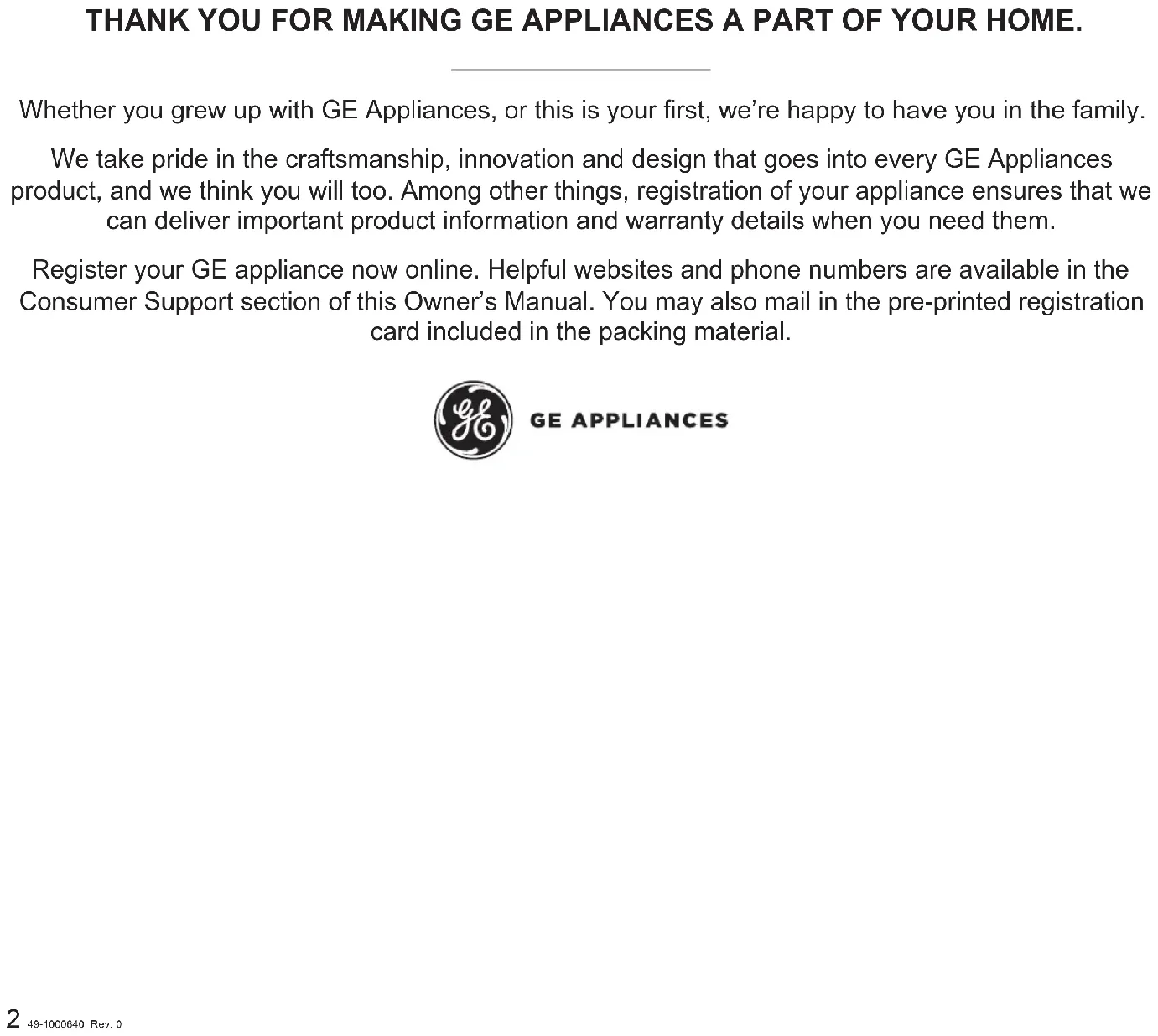- CONSUMER SUPPORT 49-1000640 Rev. 0 THANK YOU FOR MAKING GE APPLIANCES A PART OF YOUR HOME. Whether you grew up with GE Appliances, or this is your first, we’re happy to have you in the family. We take pride in the craftsmanship, innovation and design that goes into every GE Appliances product, and we think you will too. Among other things, registration of your appliance ensures that we can deliver important product information and warranty details when you need them. Register your GE appliance now online. Helpful websites and phone numbers are available in the Consumer Support section of this Owner’s Manual. You may also mail in the pre-printed registration card included in the packing material.49-1000640 Rev. 0 3 SAFETY INFORMATION p. 282