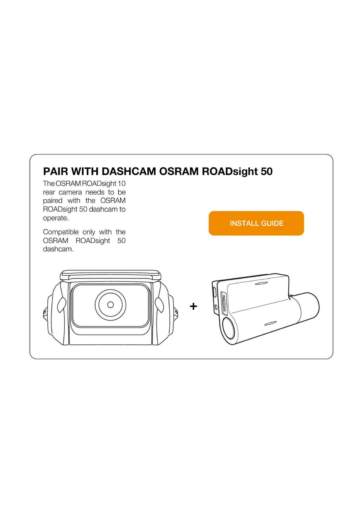 4PAIR WITH DASHCAM OSRAM ROADsight 50 The OSRAM ROADsight 10 rear camera needs to be paired with the OSRAM ROADsight 50 dashcam to operate. Compatible only with the OSRAM ROADsight 50 dashcam. INSTALL GUIDE