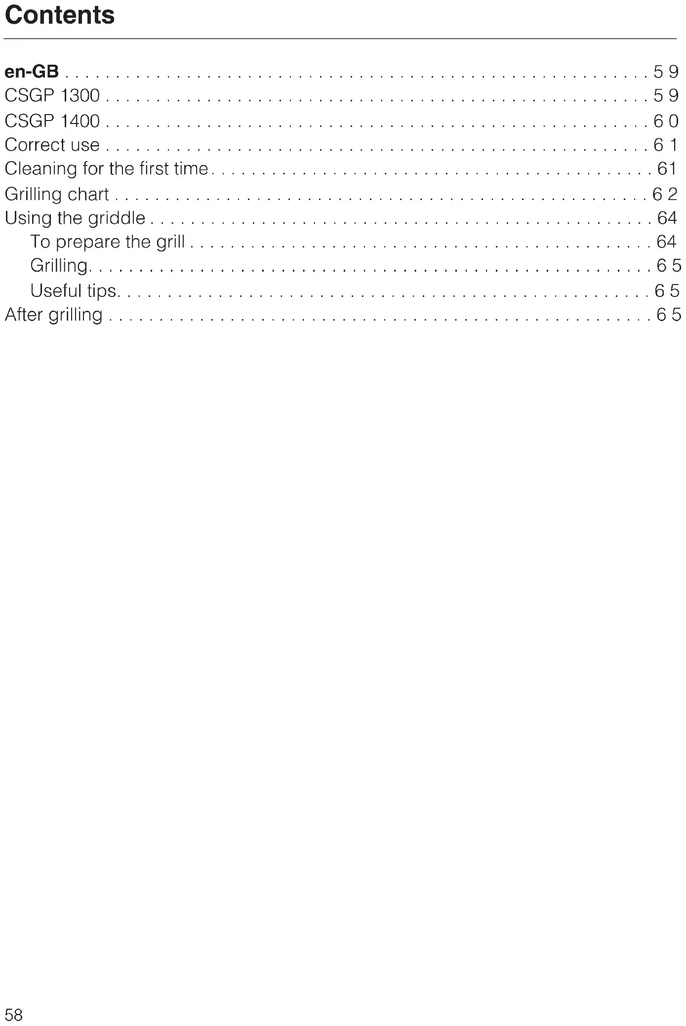 - After grilling Contents 58CSGP 1300 Ribbed side Smooth side Frame Handle en-GB 59CSGP 1400 Ribbed side Smooth side Frame Handle Accessories The griddle, the frame and the handle can all be ordered individually if a replacement is required. These can be ordered via the internet at www.miele-shop.com, from Miele (see back cover for contact details) or from your Miele dealer. en-GB 60Keep these instructions in a safe place for reference, and pass them on to any future user. Correct use This griddle is designed to be used with the Miele CS 1312 and CS 1322 open barbecue grills only. It is intended for domestic use only, and may only be used as described in these instructions. Any other usage is at the owner's risk and could be dangerous. The manufacturer cannot be held liable for damage resulting from its incorrect or improper use. Cleaning for the first time Clean the griddle with a solution of warm water and a little washing-up liquid applied with a soft sponge. en-GB 61Grilling chart The times given in the chart serve as a guide, based on a pre-heated griddle using settings 9 to 12. The grilling time required will depend on the type of food, its texture and thickness as well as personal taste. Food Time in minutes Meat and sausages Sausages 6 - 8 Fillet steak 4 - 10 Burgers 12 - 16 Chicken drumsticks 16 - 18 Lamb chops 4 - 8 Liver 3 - 6 Turkey escalopes 8 - 10 Kebabs 14 - 18 Escalopes 8 - 12 Spare ribs 15 - 25 T-bone steak 10 - 20 Fish and seafood Trout 12 - 16 Prawns 2 - 4 Salmon steak 10 - 12 Mackerel 10 - 12 Tuna steak 6 - 8 en-GB 62Food Time in minutes Vegetables Aubergines, sliced 6 - 8 Jacket potatoes, pre-cooked 10 - 20 Vegetable kebabs 5 - 6 Corn on the cob, pre-cooked 5 - 8 Peppers, cut into strips 2 - 3 Tomato halves 2 - 4 Leeks, sliced 2 - 4 Mushrooms, sliced 2 - 4 Onions, sliced 2 - 4 Fruit Pineapple slices 2 - 3 Banana slices 1 - 2 Peach halves 2 - 3 Apple slices 2 - 3 Miscellaneous Toast 2 - 3 Fried eggs 1 - 2 Blinis 2 - 4 Potato pancakes 6 - 8 Pancakes 2 - 4 Tofu 2 - 4 en-GB 63Using the griddle Food can be cooked on either the ribbed or the smooth side of the griddle. We recommend the ribbed side for meat that is not coated in breadcrumbs, and the smooth side for all other types of food. The lava rock container must be removed when the griddle is being used, and the grill trough filled with water. The grill has 2 heating elements which can be switched on and regulated independently. Both elements can be used together when grilling large quantities of food. For smaller quantities, the front element can be used to grill the food whilst the rear element can be used to keep food warm at setting 3. Never place the griddle on the grill rack or directly onto the heating elements to grill. The griddle must be only used in the frame supplied. To prepare the grill p. 65