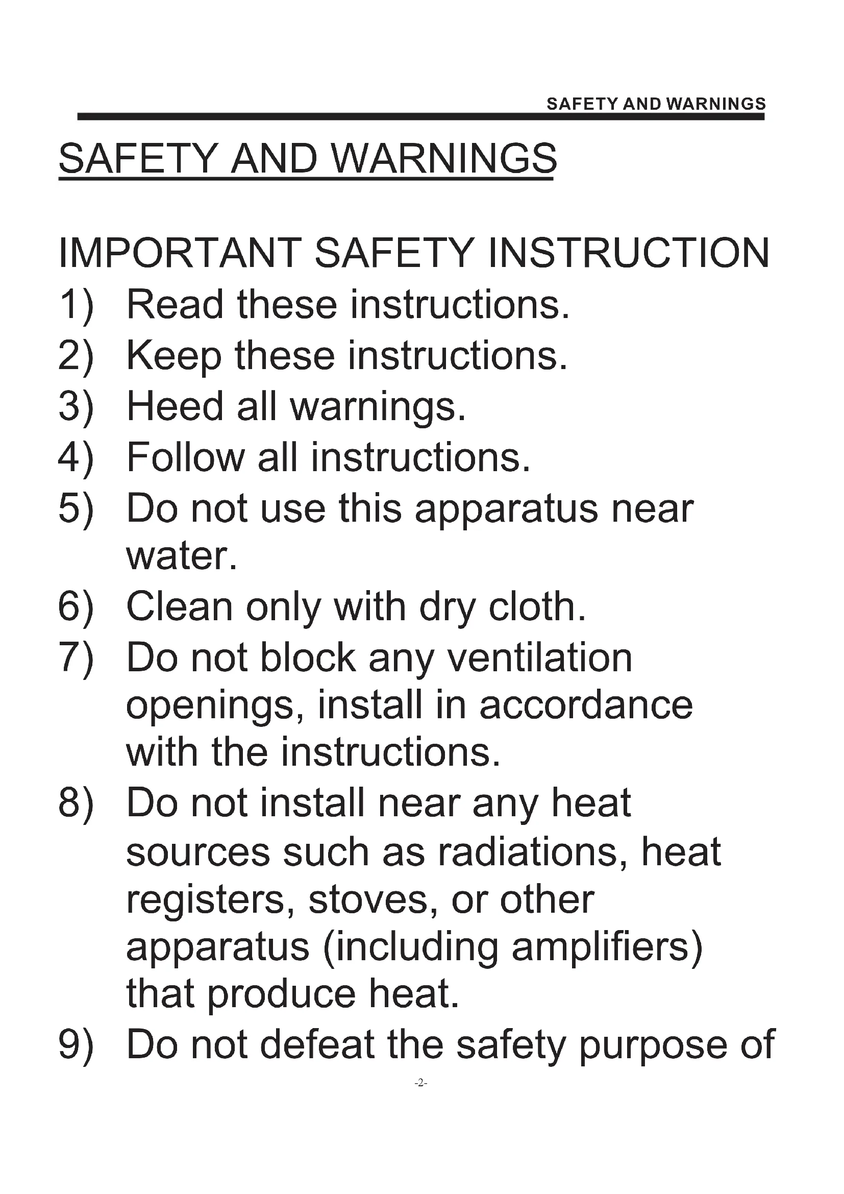 the polarized plug. If the provided plug does not fit into your outlet, consult an electrician for replacement of the obsolete outlet. 10) Protected the power cord from being walked on or pinched particularly at plugs, convenience receptacles, and the point where they exit from the apparatus. 11) Only use attachments/accessories specified by the manufacturer. 12) Unplug this apparatus during lighting storms or when unused for long periods of time. 13) Refer all servicing to qualified service personnel. Servicing is required when the apparatus has been damaged in any way, such as power-supply cord or plug is damaged, liquid has been spilled-4-
