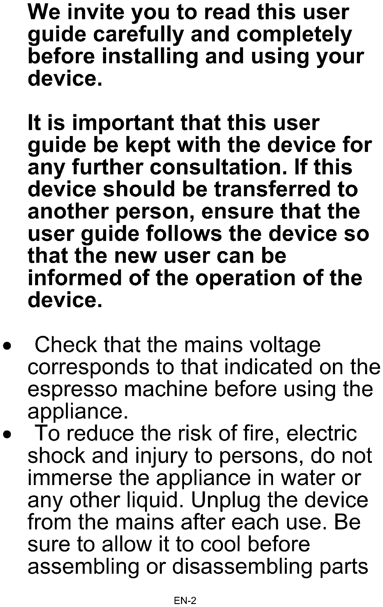 - To reduce the risk of fire, electric shock and injury to persons, do not immerse the appliance in water or any other liquid. Unplug the device from the mains after each use. Be sure to allow it to cool before assembling or disassembling partsEN-3 and before cleaning.