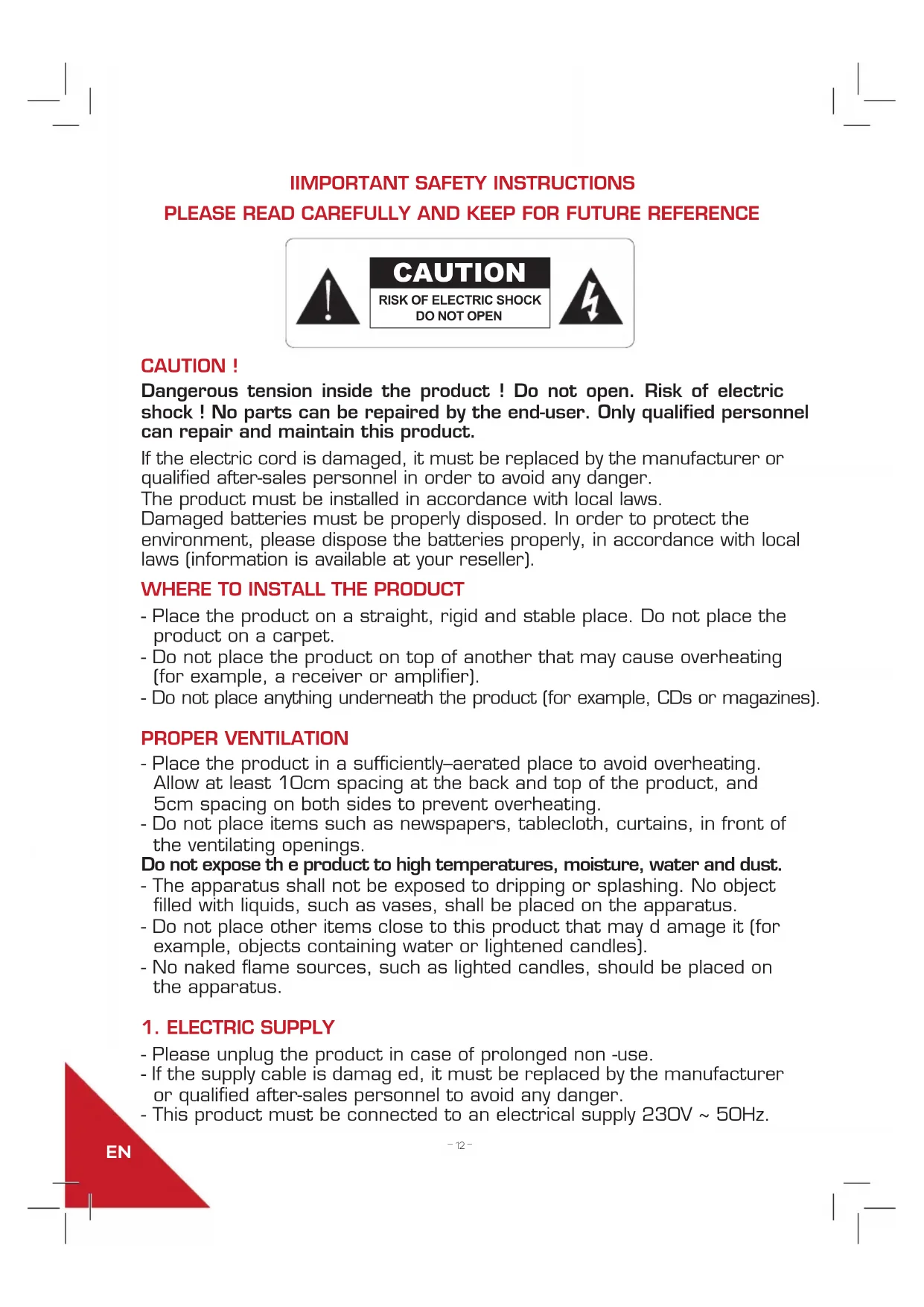 - Please unplug the product in case of prolonged non -use. - If the supply cable is damag ed, it must be replaced by the manufacturer or qualied after-sales personnel to avoid any danger. - This product must be connected to an electrical supply 230V ~ 50Hz.