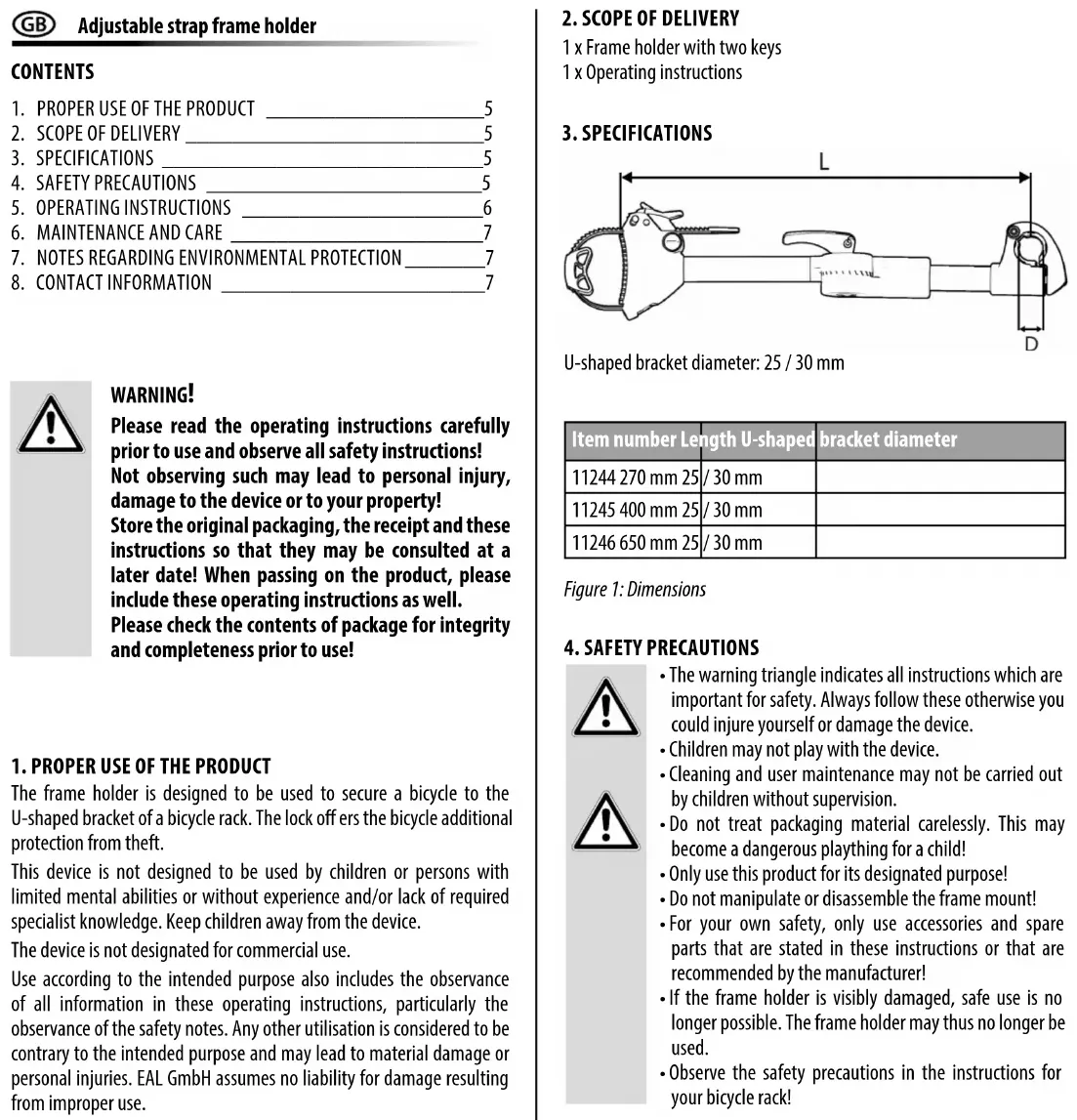 - Observe the safety precautions in the instructions for your bicycle rack! Figure 1: Dimensions Item number Length U-shaped bracket diameter 11244 270 mm 25 / 30 mm 11245 400 mm 25 / 30 mm 11246 650 mm 25 / 30 mm U-shaped bracket diameter: 25 / 30 mm6 If the frame holder is set to 180 °, the safety function of the lock is no longer given. Therefore, only use the frame holder with a „slight bend“.