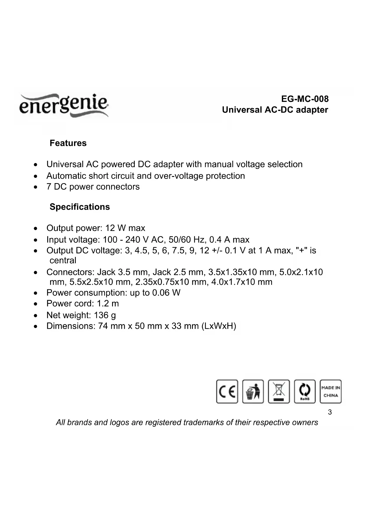 Універсальний адаптер живлення постійного струму3 EG-MC-008 Universal AC-DC adapter All brands and logos are registered trademarks of their respective owners Features Universal AC powered DC adapter with manual voltage selection Automatic short circuit and over-voltage protection 7 DC power connectors Specifications Output power: 12 W max Input voltage: 100 - 240 V AC, 50/60 Hz, 0.4 A max Output DC voltage: 3, 4.5, 5, 6, 7.5, 9, 12 +/- 0.1 V at 1 A max, "+" is central Connectors: Jack 3.5 mm, Jack 2.5 mm, 3.5x1.35x10 mm, 5.0x2.1x10 mm, 5.5x2.5x10 mm, 2.35x0.75x10 mm, 4.0x1.7x10 mm Power consumption: up to 0.06 W Power cord: 1.2 m Net weight: 136 g Dimensions: 74 mm x 50 mm x 33 mm (LxWxH)4 EG-MC-008 Universal AC-DC adapter All brands and logos are registered trademarks of their respective owners