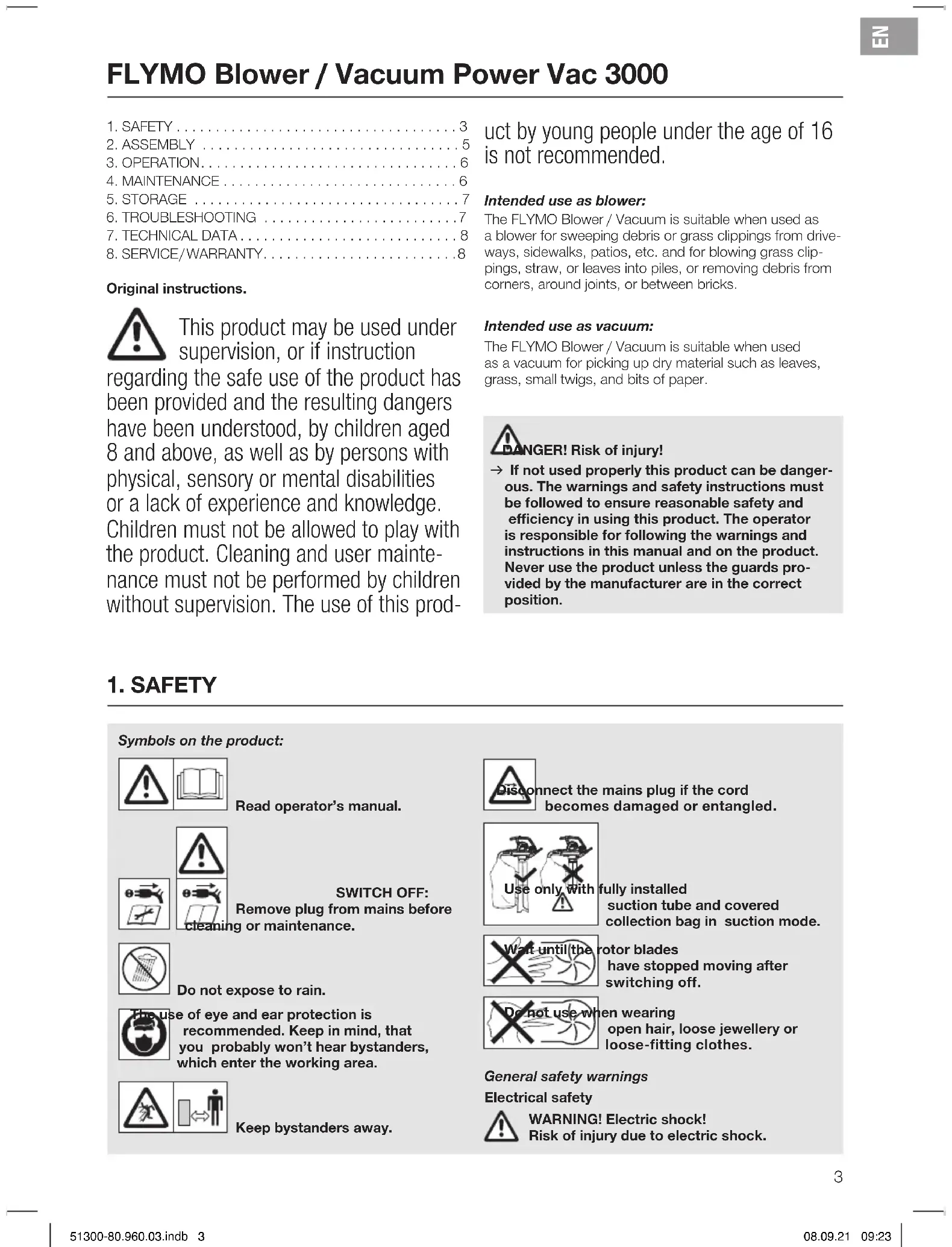 Original instructions. This product may be used under supervision, or if instruction regarding the safe use of the product has been provided and the resulting dangers have been understood, by children aged 8 and above, as well as by persons with physical, sensory or mental disabilities or a lack of experience and knowledge. Children must not be allowed to play with the product. Cleaning and user mainte- nance must not be performed by children without supervision. The use of this prod- uct by young people under the age of 16 is not recommended. Intended use as blower: The FLYMO Blower / Vacuum is suitable when used as ablower for sweeping debris or grass clippings from drive- ways, sidewalks, patios, etc. and for blowing grass clip- pings, straw, orleaves into piles, or removing debris from corners, around joints, or between bricks. Intended use as vacuum: The FLYMO Blower / Vacuum is suitable when used asavacuum for picking up dry material such as leaves, grass, small twigs, and bits of paper. DANGER! Risk of injury! v If not used properly this product can be danger- ous. The warnings and safety instructions must be followed to ensure reasonable safety and efficiency in using this product. The operator is responsible for following the warnings and instructions in this manual and on the product. Never use the product unless the guards pro- vided by the manufacturer are in the correct position.