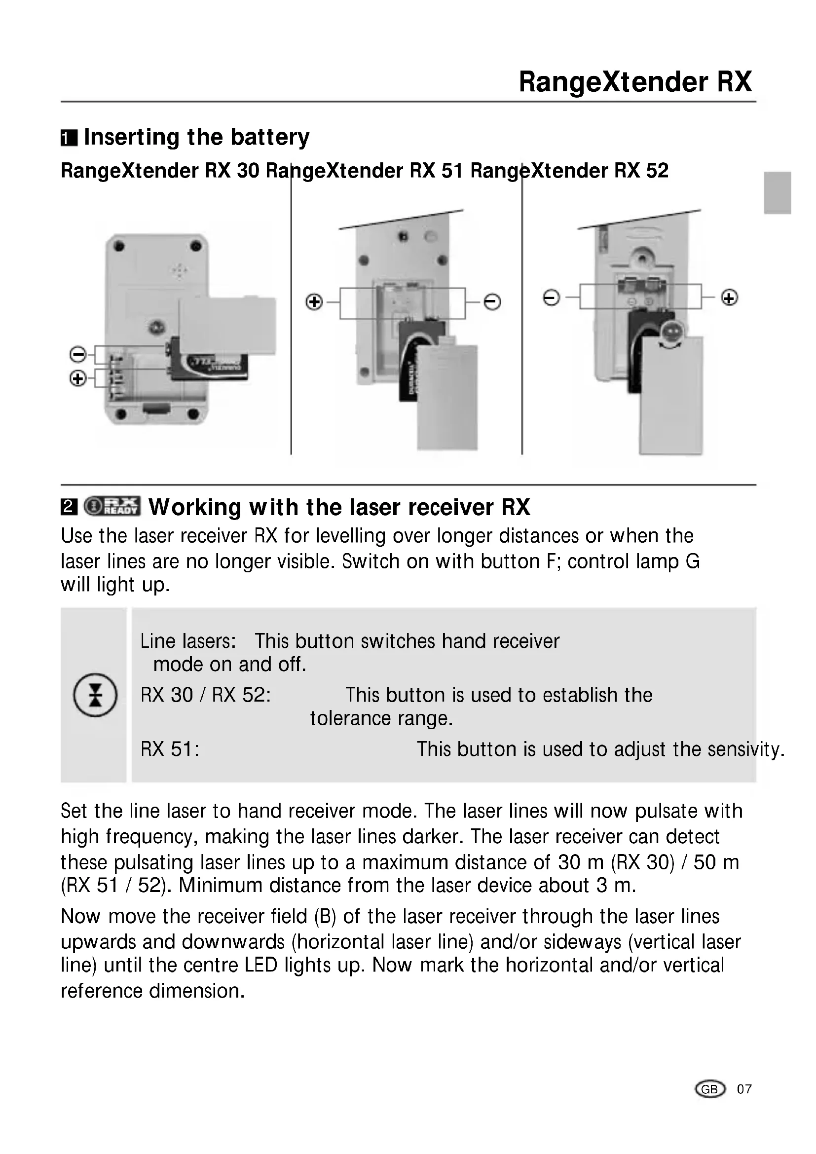 Inserting the battery Use the laser receiver RX for levelling over longer distances or when the laser lines are no longer visible. Switch on with button F; control lamp G will light up. Working with the laser receiver RX Set the line laser to hand receiver mode. The laser lines will now pulsate with high frequency, making the laser lines darker. The laser receiver can detect these pulsating laser lines up to a maximum distance of 30 m (RX 30) / 50 m (RX 51 / 52). Minimum distance from the laser device about 3 m. Now move the receiver field (B) of the laser receiver through the laser lines upwards and downwards (horizontal laser line) and/or sideways (vertical laser line) until the centre LED lights up. Now mark the horizontal and/or vertical reference dimension. Line lasers: This button switches hand receiver mode on and off. RX 30 / RX 52: This button is used to establish the tolerance range. RX 51: This button is used to adjust the sensivity.