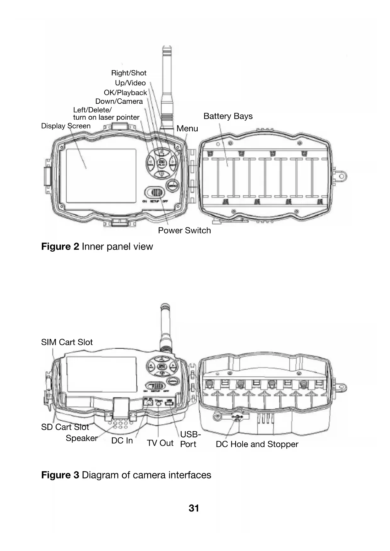 Camera Lens Laser Pointer LED Lock Hole PIR- Motion Detector Figure 1 Diagram of camera functional indicators31 Display Screen Figure 2 Inner panel view Speaker Figure 3 Diagram of camera interfaces Right/Shot Up/Video OK/Playback Down/Camera Left/Delete/ turn on laser pointer Power Switch Menu Battery Bays SIM Cart Slot DC In TV Out USB- Port DC Hole and Stopper SD Cart Slot32