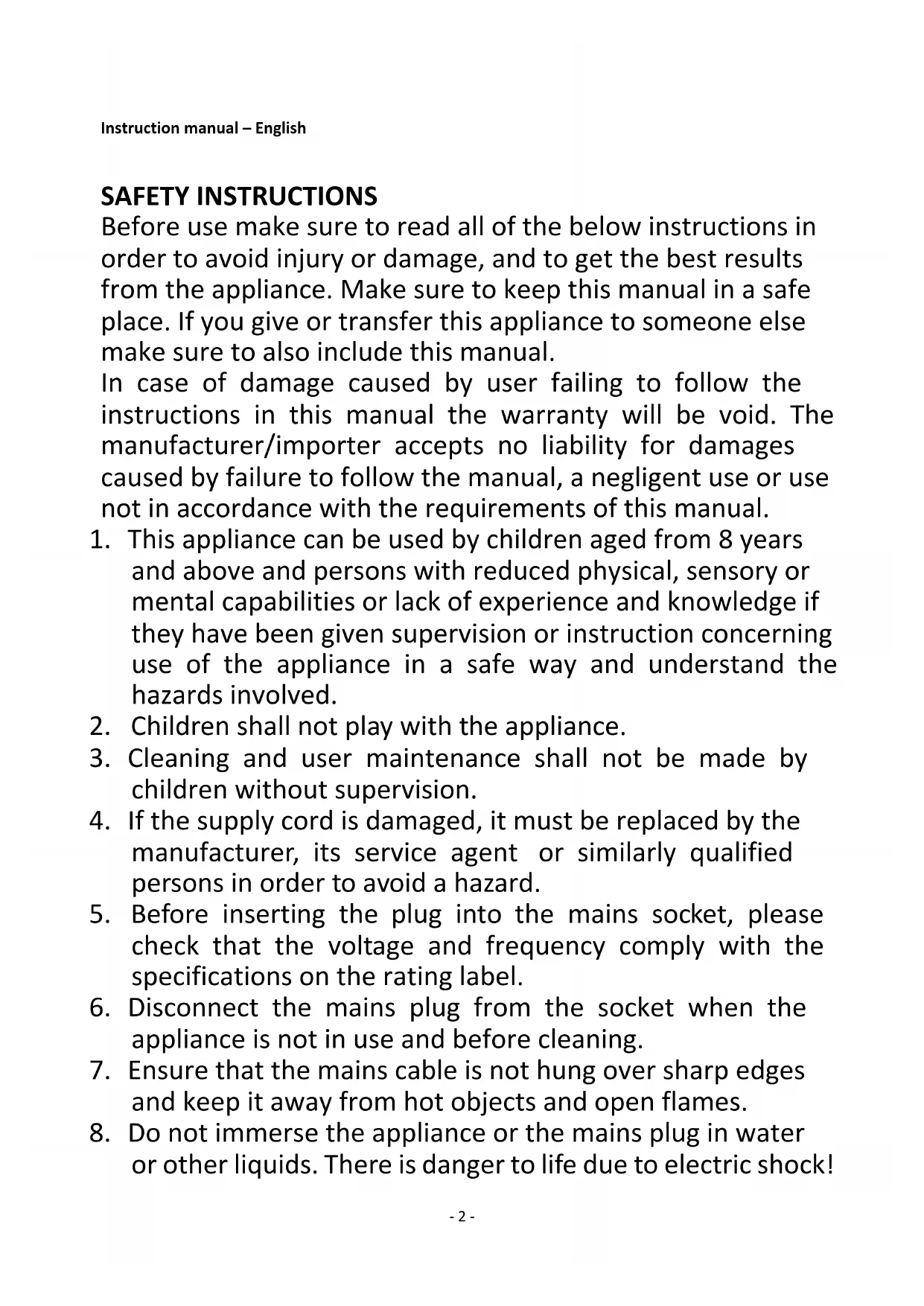 Before delivery our devices are subjected to rigorous quality control. If, despite all care, damage has occurred during production or transportation, please return the device to your dealer. In addition to statutory legal rights, the purchaser has an option to claim under the terms of the following guarantee: For the purchased device we provide 2 years guarantee, commencing from the day of sale. If you have a defective product, you can directly go back to the point of purchase. Defects which arise due to improper handling of the device and malfunctions due to interventions and repairs by third parties or the fitting of non-original parts are not covered by this guarantee. Always keep your receipt, without the receipt you can’t claim any form of warranty. Damage caused by not following the instruction manual, will lead to a void of warranty, if this results in consequential damages then we will not be liable. Neither can we hold responsible for material damage or personal injury caused by improper use if the instruction manual is not properly executed. Damage to accessories does not mean free replacement of the whole appliance. In such case please contact our service department. Broken glass or breakage of plastic parts is always subject to a charge. Defects to consumables or parts subjected to wearing, as well as cleaning, maintenance or the replacement of said parts are not covered by the warranty and are to be paid.